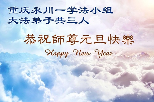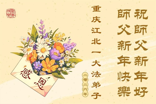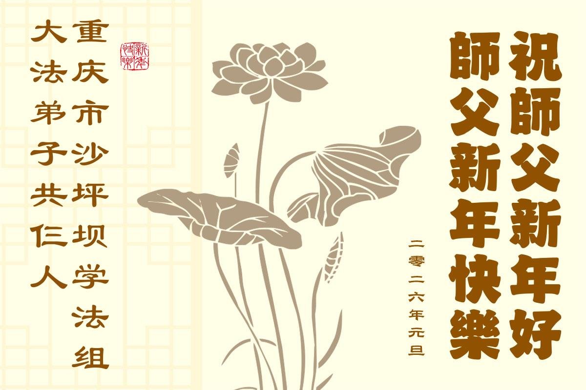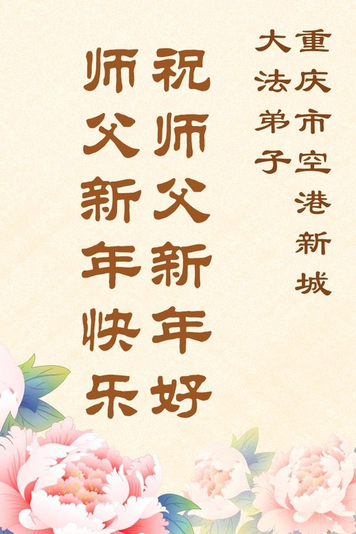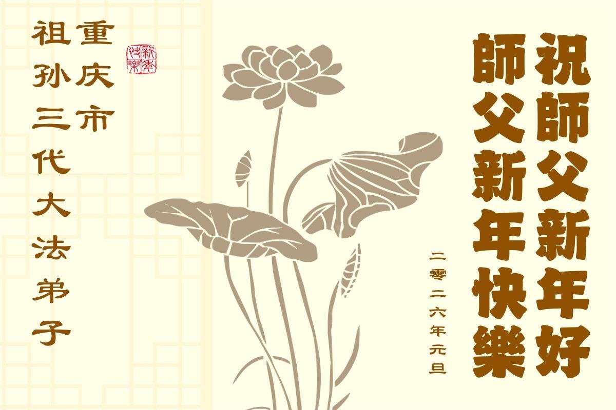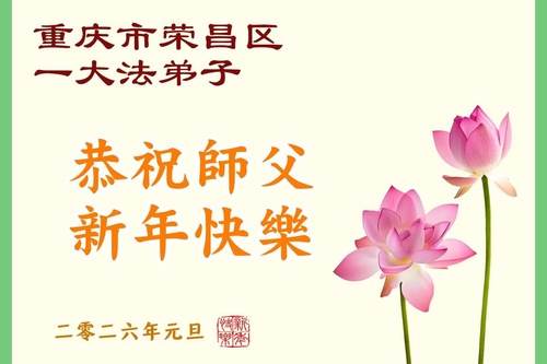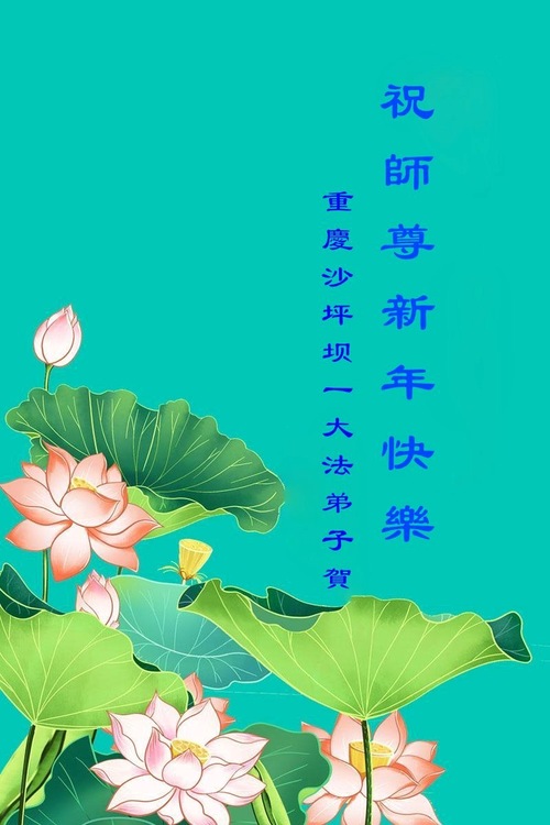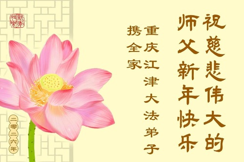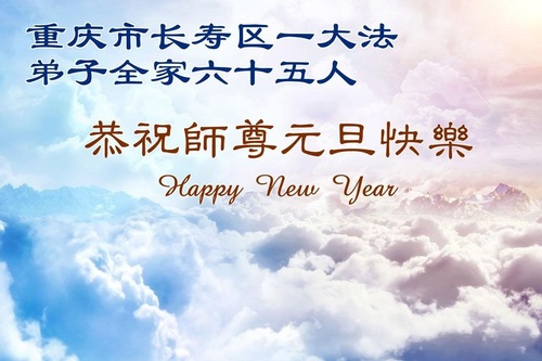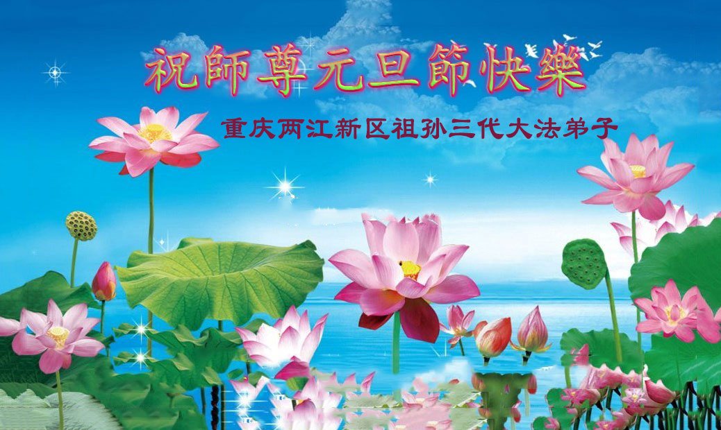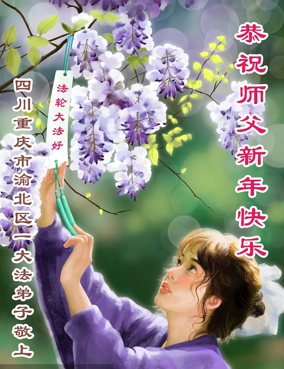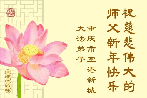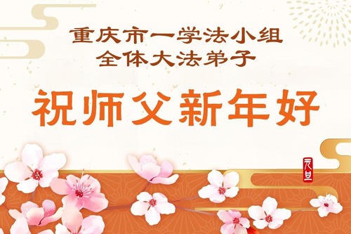 (Minghui.org) Zu Neujahr senden Falun-Dafa-Praktizierende auf der ganzen Welt traditionell Neujahrsgrüße, Grußkarten, Gedichte und Fotos an die Minghui-Website. Damit wünschen sie ihrem verehrten Meister Li Hongzhi ein frohes neues Jahr und bringen dem Meister ihre Dankbarkeit für die barmherzige Errettung zum Ausdruck. Sie geloben, in ihrer Kultivierung fleißig voranzukommen und noch mehr Lebewesen zu erretten. Im Folgenden veröffentlichen wir einen Teil dieser Grüße aus der Stadt Chongqing: