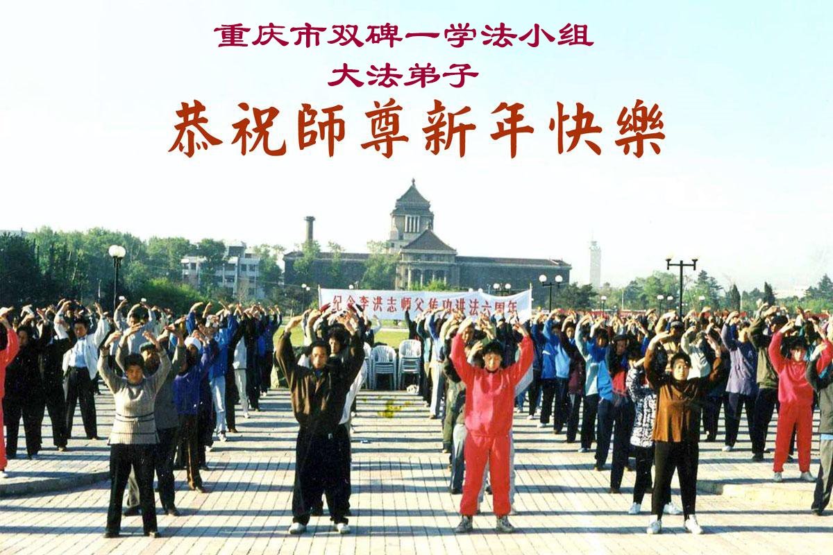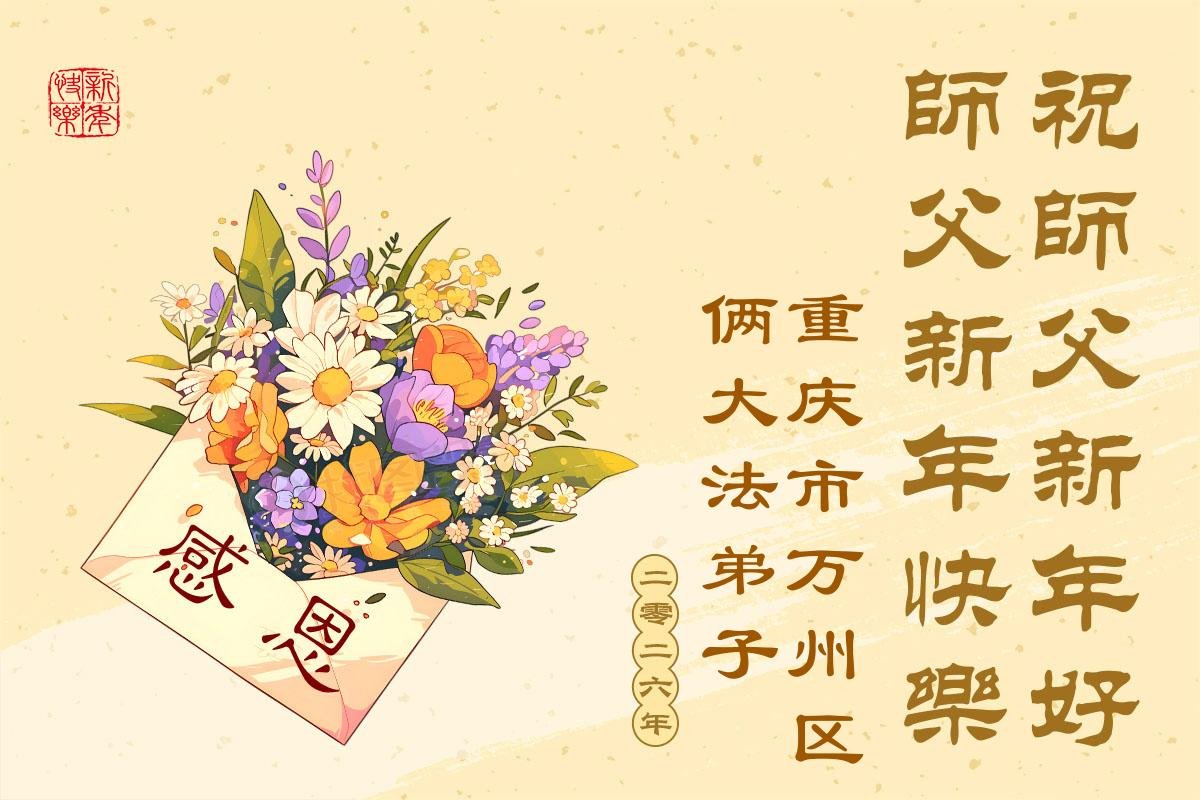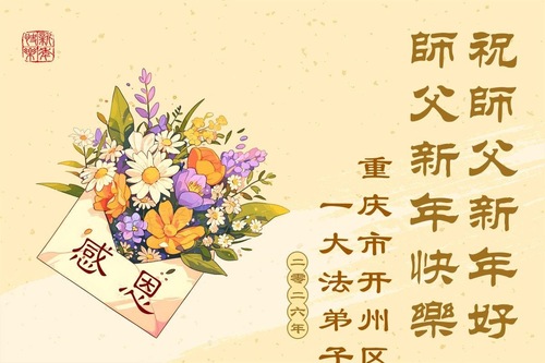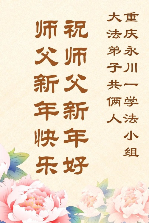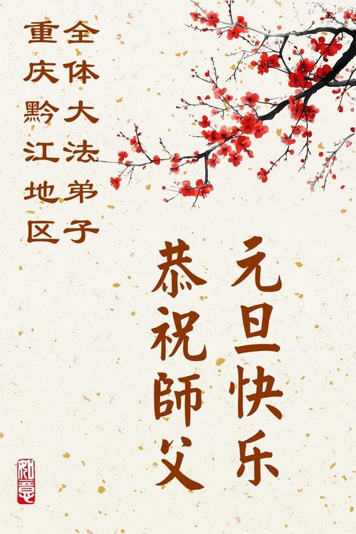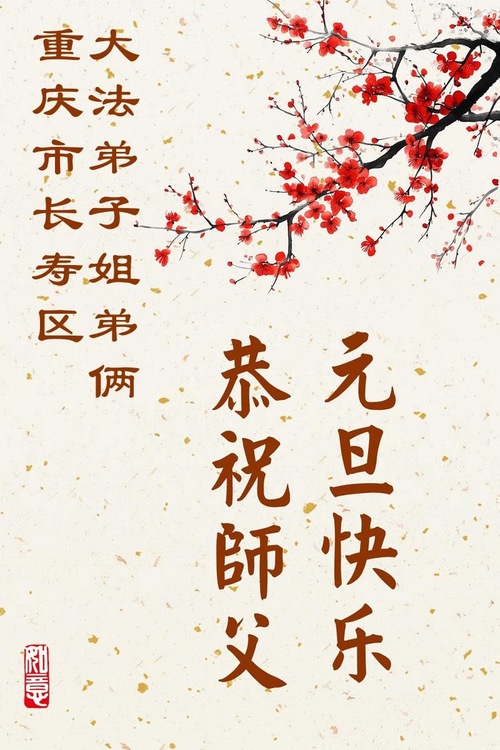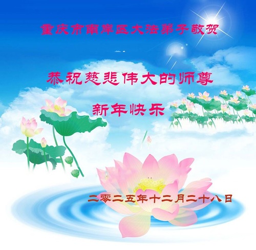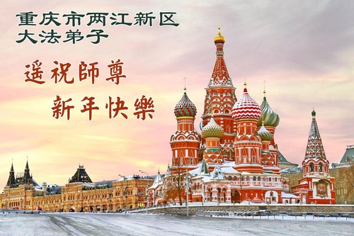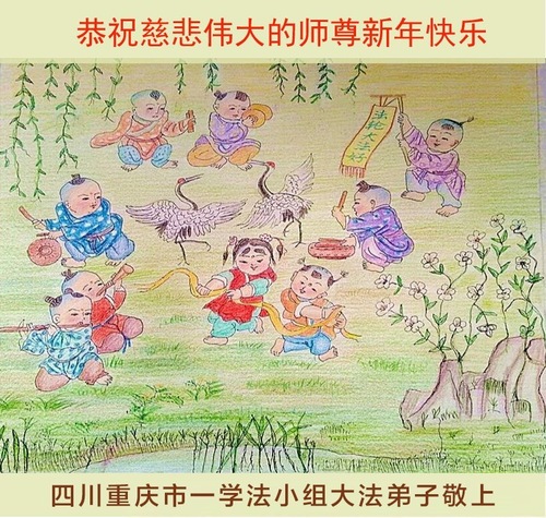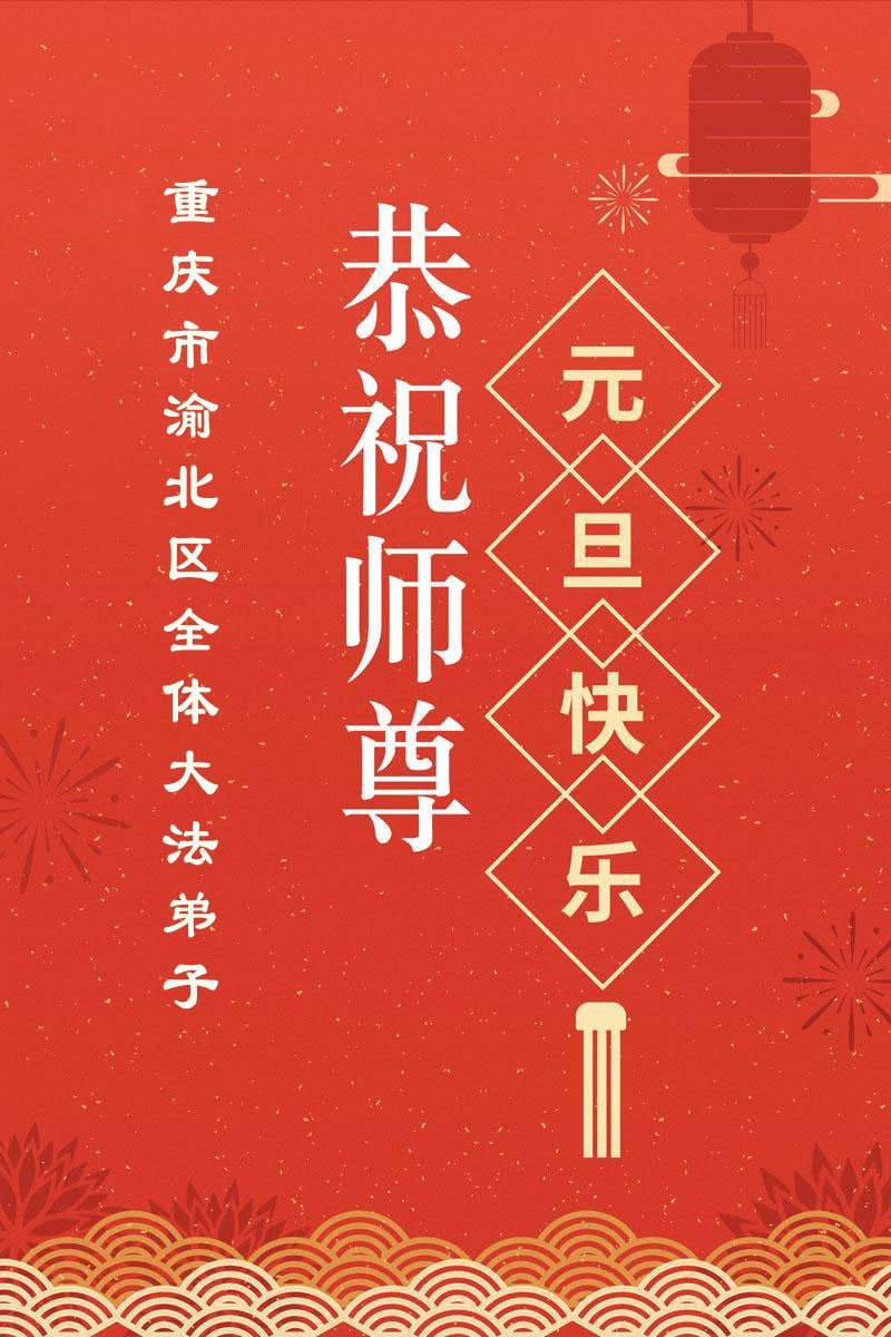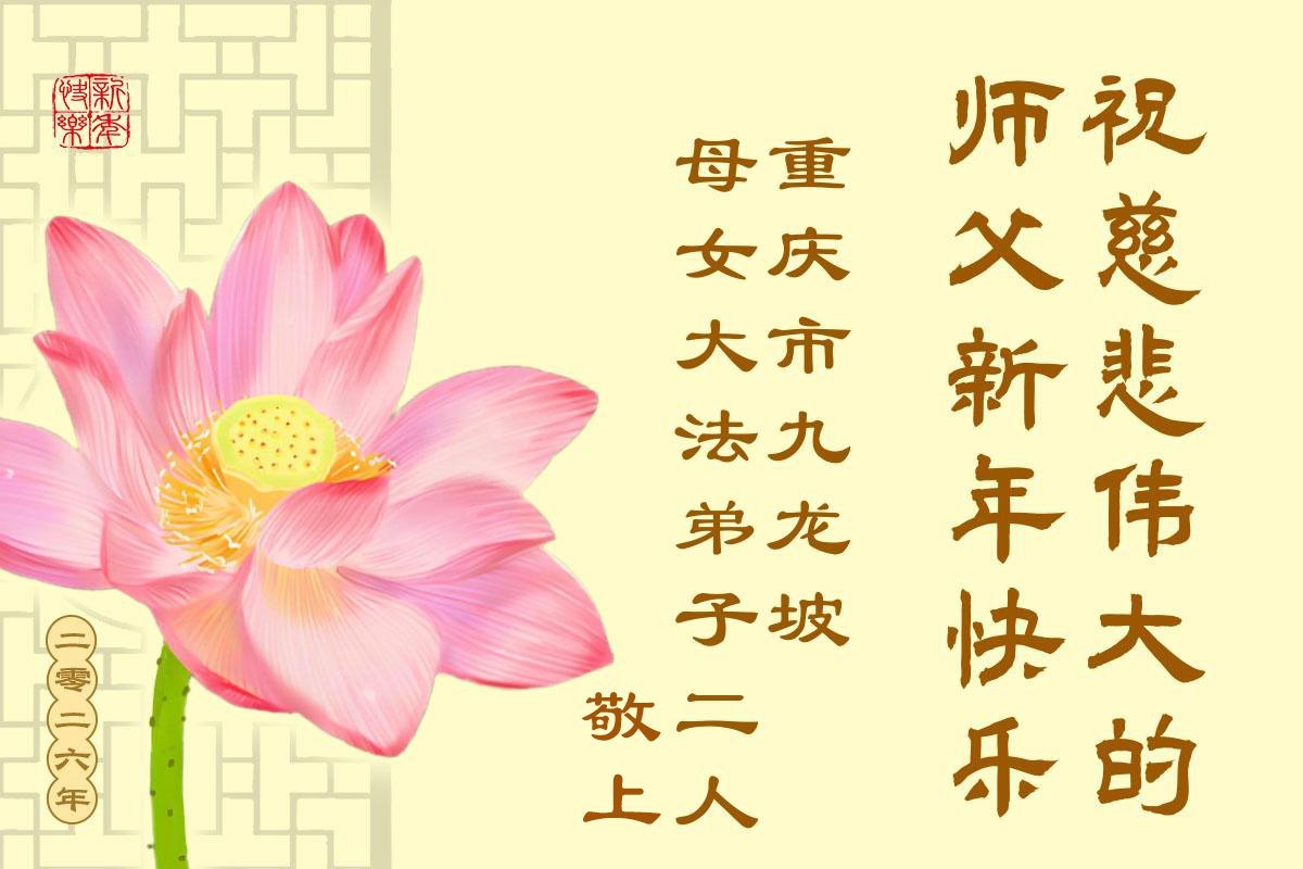 (Minghui.org) Zu Neujahr senden Falun-Dafa-Praktizierende auf der ganzen Welt traditionell Neujahrsgrüße, Grußkarten, Gedichte und Fotos an die Minghui-Website. Damit wünschen sie ihrem verehrten Meister Li Hongzhi ein frohes neues Jahr und bringen dem Meister ihre Dankbarkeit für die barmherzige Errettung zum Ausdruck. Sie geloben, in ihrer Kultivierung fleißig voranzukommen und noch mehr Lebewesen zu erretten. Im Folgenden veröffentlichen wir einen Teil dieser Grüße aus der Stadt Chongqing: