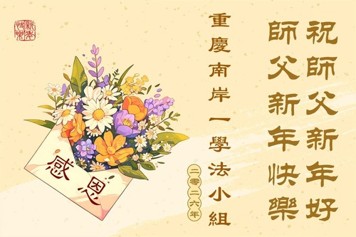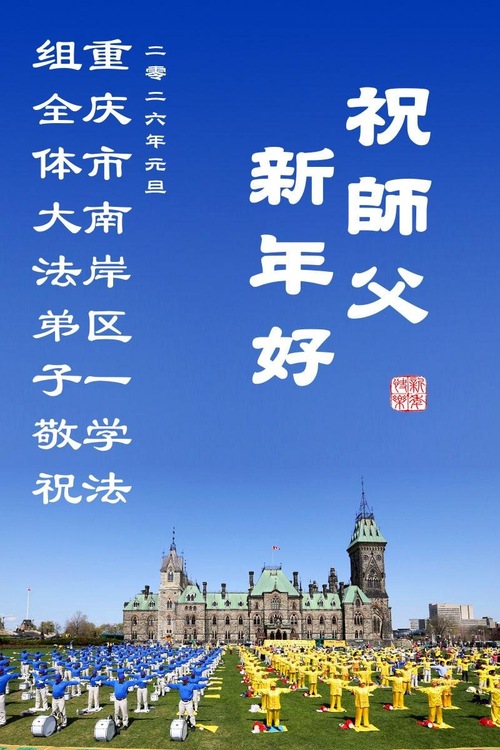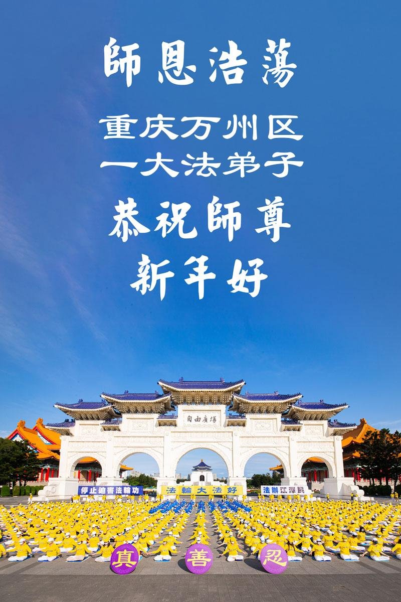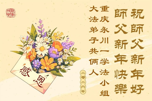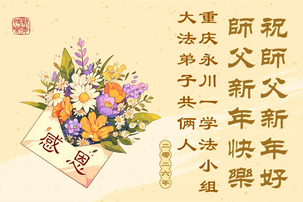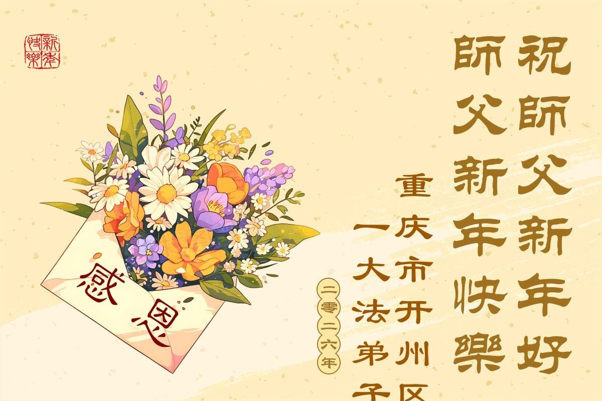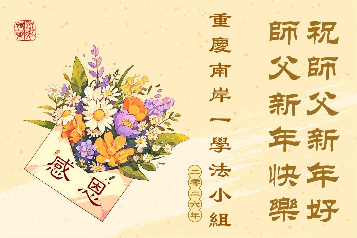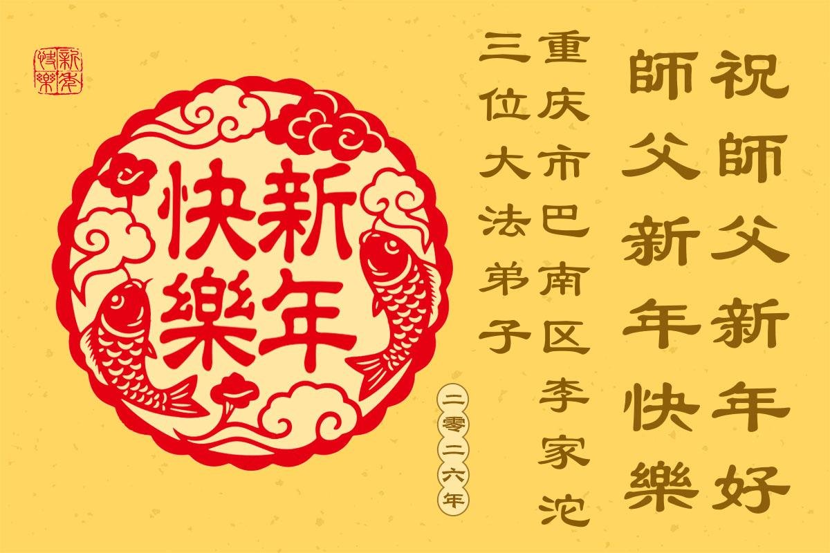 (Minghui.org) Zu Neujahr senden Falun-Dafa-Praktizierende auf der ganzen Welt traditionell Neujahrsgrüße, Grußkarten, Gedichte und Fotos an die Minghui-Website. Damit wünschen sie ihrem verehrten Meister Li Hongzhi ein frohes neues Jahr und bringen dem Meister ihre Dankbarkeit für die barmherzige Errettung zum Ausdruck. Sie geloben, in ihrer Kultivierung fleißig voranzukommen und noch mehr Lebewesen zu erretten. Im Folgenden veröffentlichen wir einen Teil dieser Grüße aus der Stadt Chongqing:
