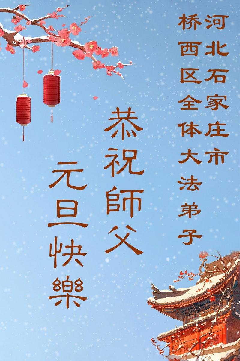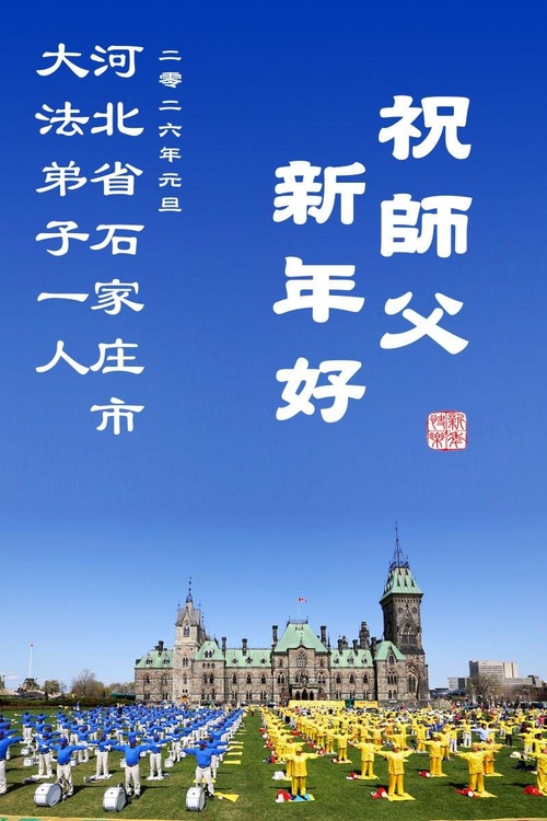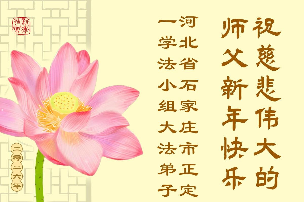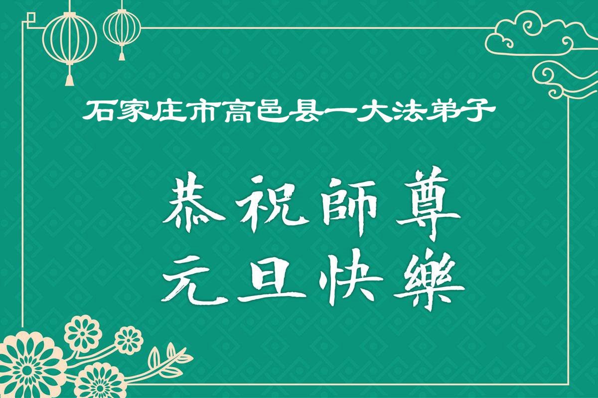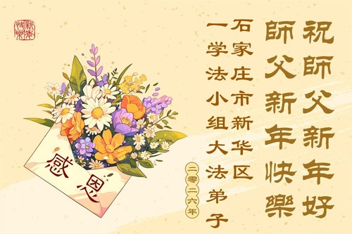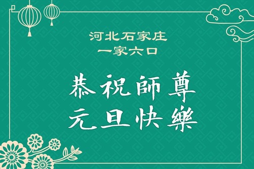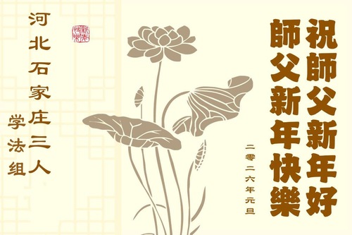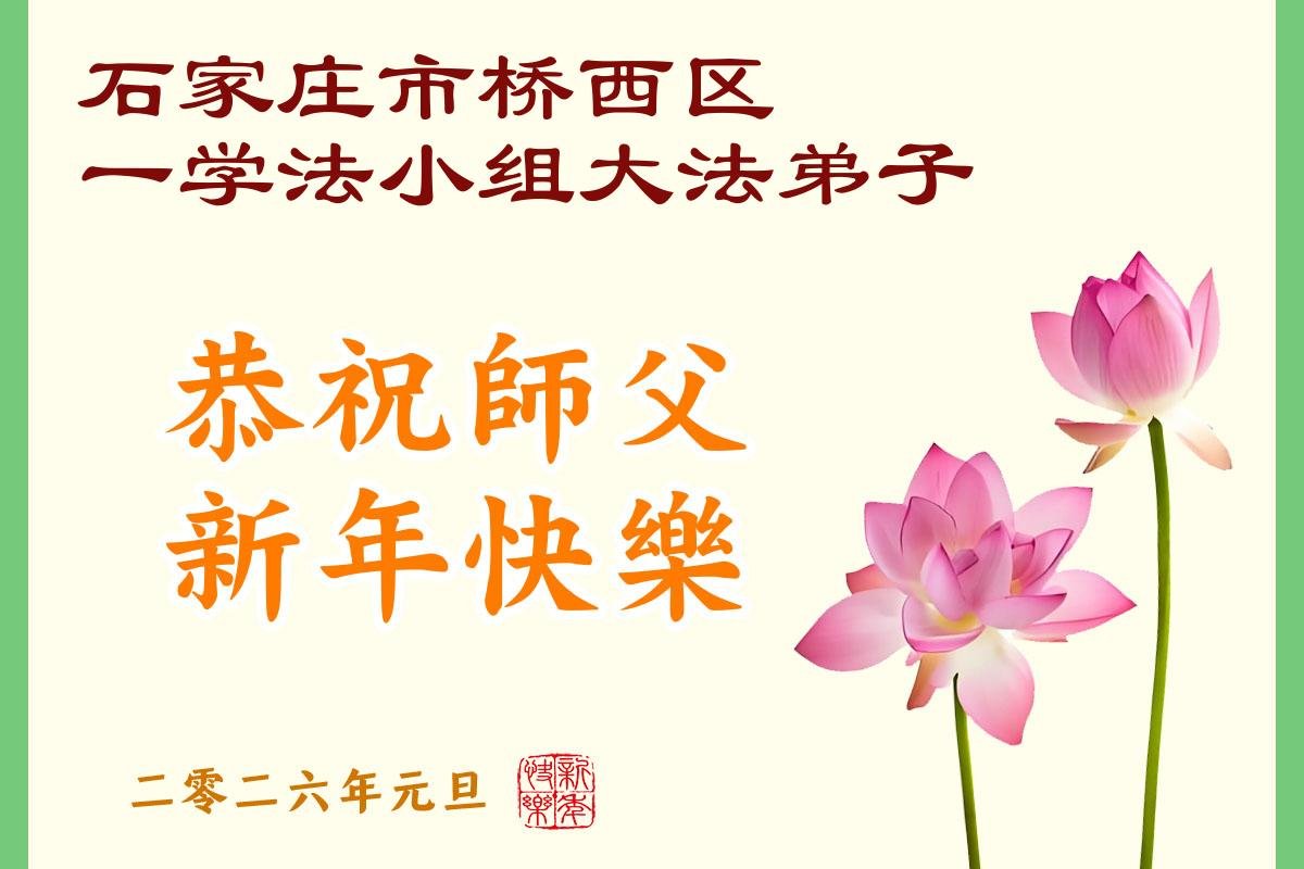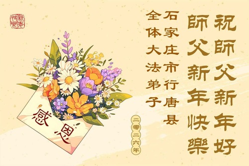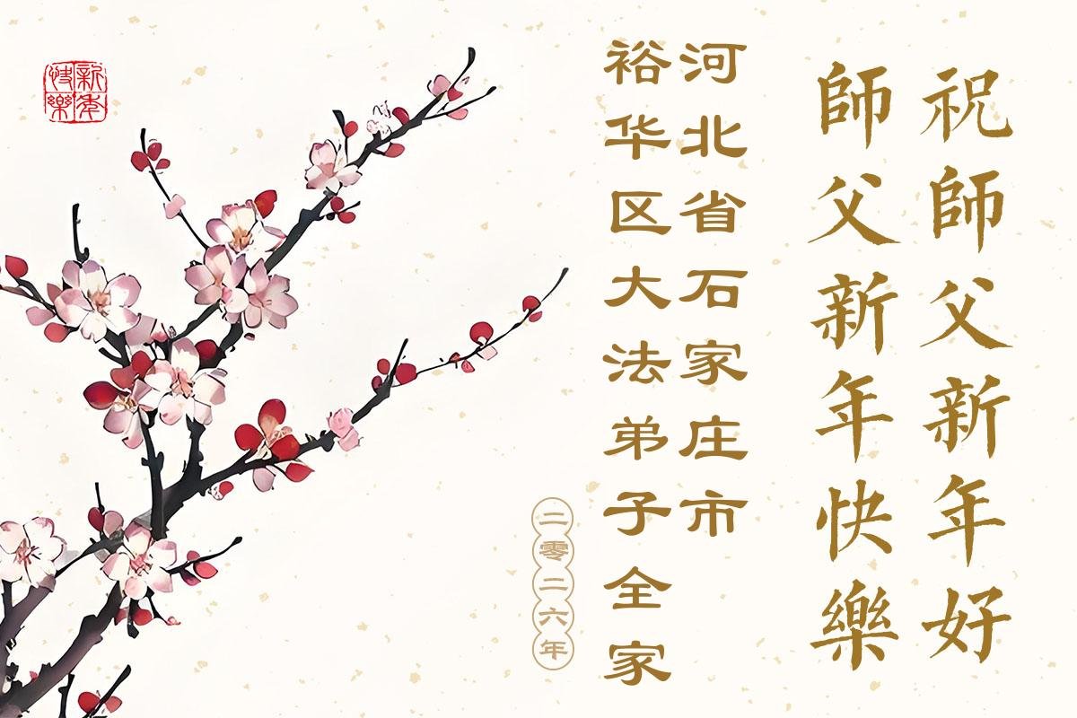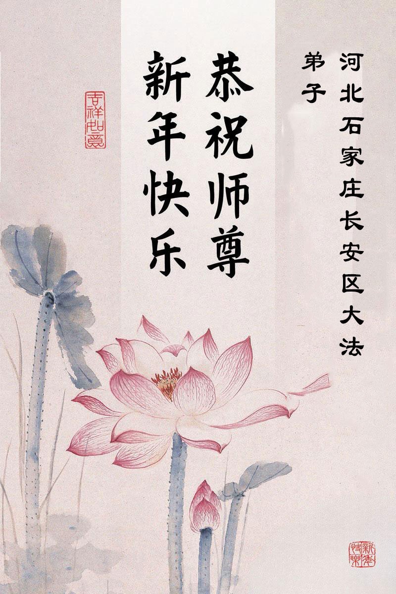 (Minghui.org) Zu Neujahr senden Falun-Dafa-Praktizierende auf der ganzen Welt traditionell Neujahrsgrüße, Grußkarten, Gedichte und Fotos an die Minghui-Website. Damit wünschen sie ihrem verehrten Meister Li Hongzhi ein frohes neues Jahr und bringen dem Meister ihre Dankbarkeit für die barmherzige Errettung zum Ausdruck. Sie geloben, in ihrer Kultivierung fleißig voranzukommen und noch mehr Lebewesen zu erretten. Im Folgenden veröffentlichen wir einen Teil dieser Grüße aus Shijiazhuang: