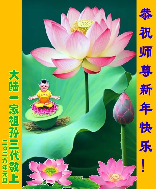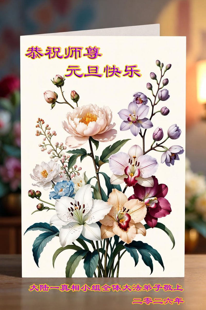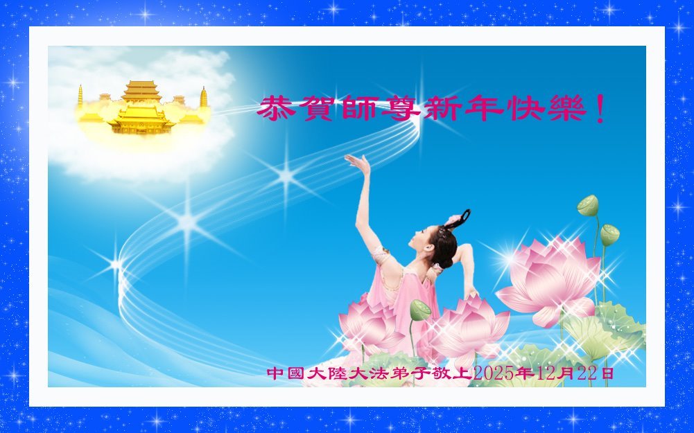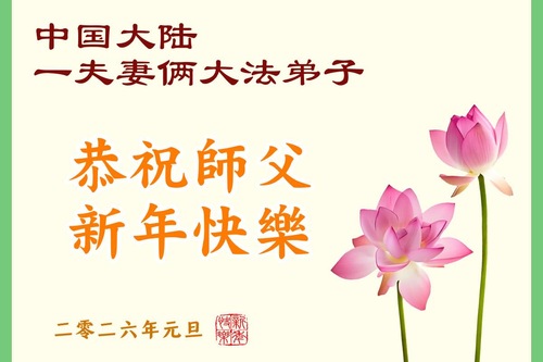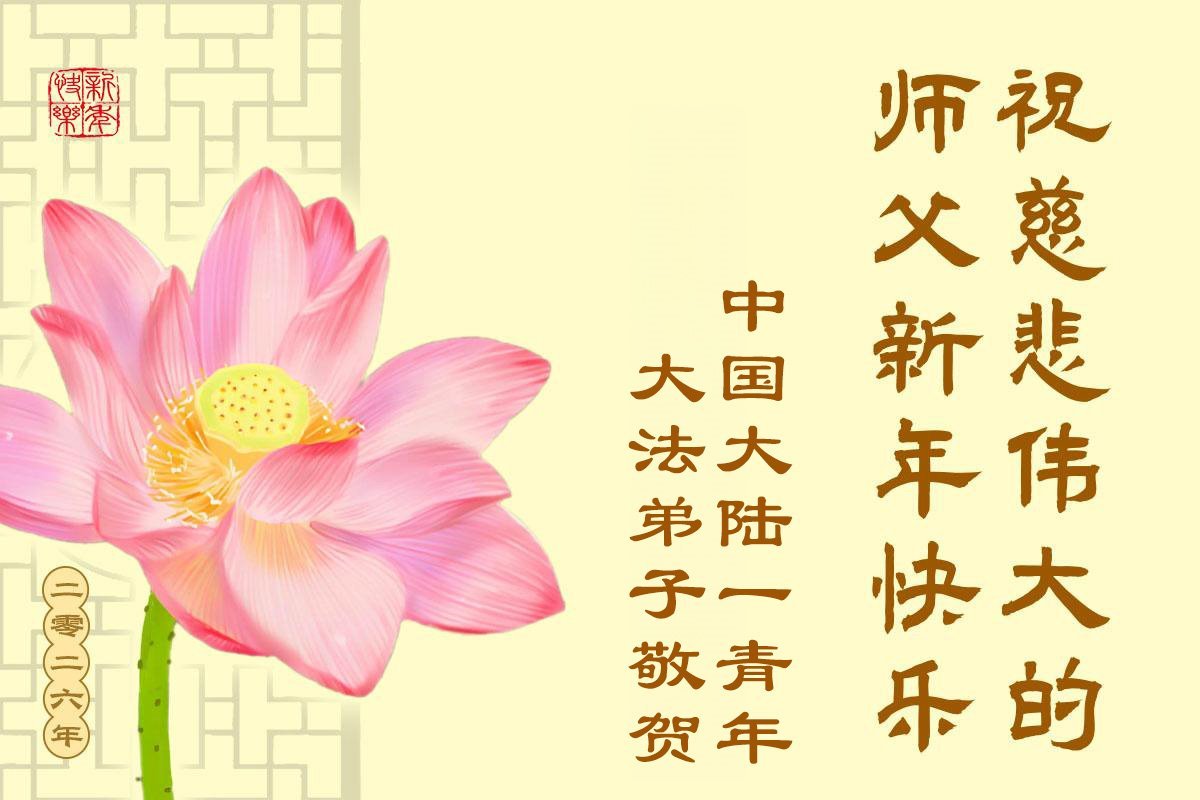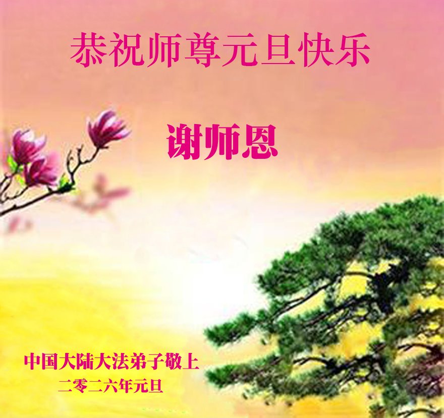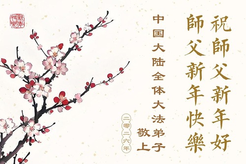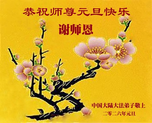 (Minghui.org) Zu Neujahr senden Falun-Dafa-Praktizierende auf der ganzen Welt traditionell Neujahrsgrüße, Grußkarten, Gedichte und Fotos an die Minghui-Website. Damit wünschen sie ihrem verehrten Meister Li Hongzhi ein frohes neues Jahr und bringen dem Meister ihre Dankbarkeit für die barmherzige Errettung zum Ausdruck. Sie geloben, in ihrer Kultivierung fleißig voranzukommen und noch mehr Lebewesen zu erretten. Im Folgenden veröffentlichen wir einen Teil dieser Grüße aus Festlandchina: