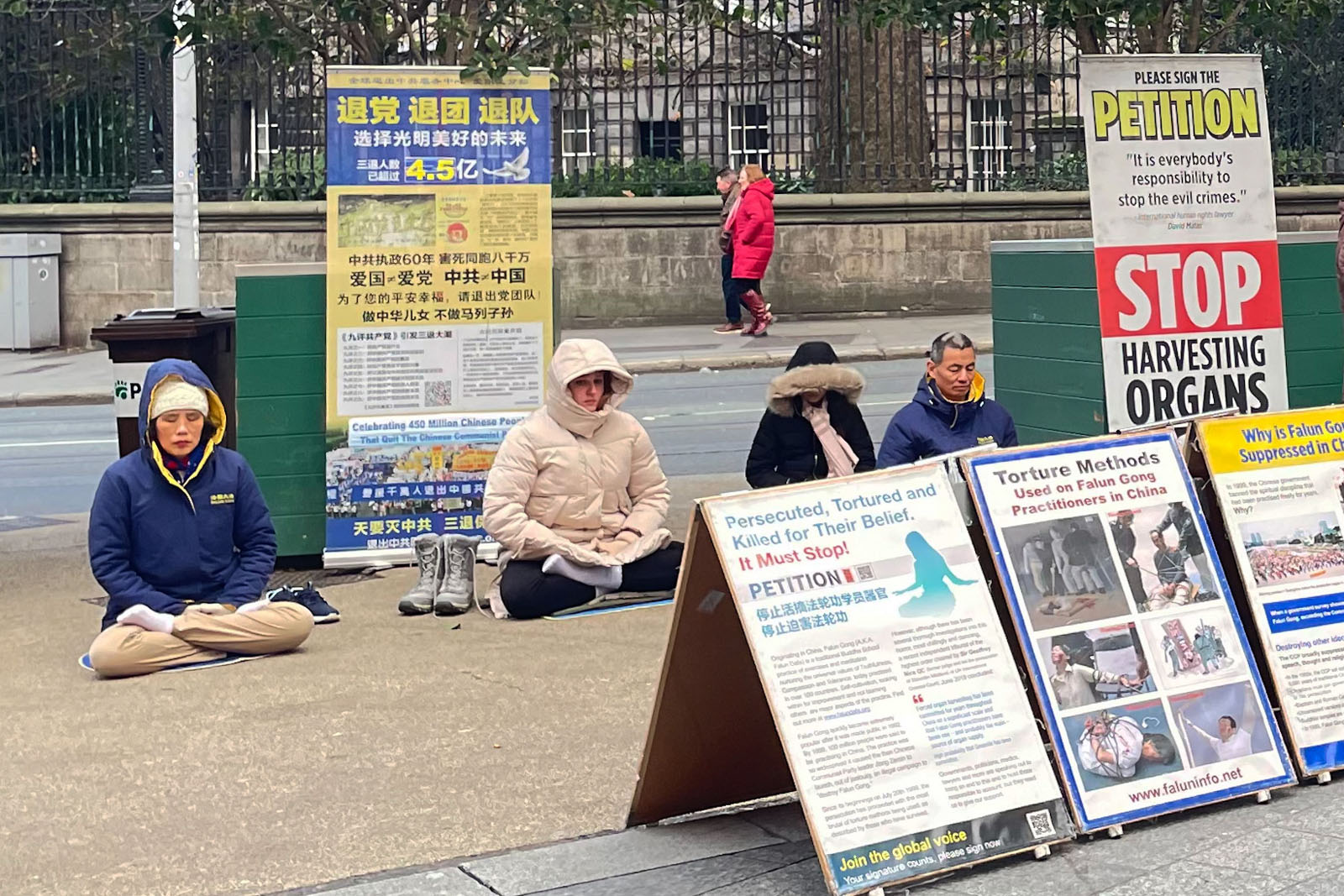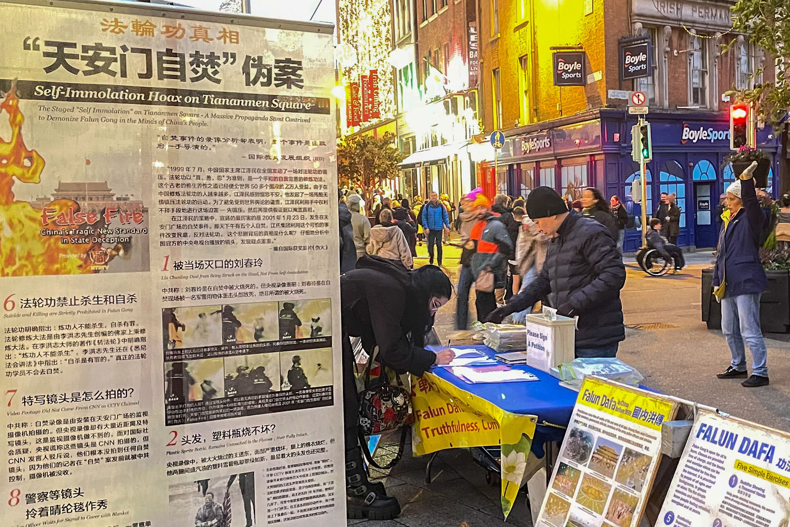 Dublins Stadtzentrum ist ein beliebtes Touristenziel. Neben einer Vielzahl von Geschäften gibt es dort auch viele historische Gebäude, darunter das Trinity College und die National Gallery of Ireland. Falun-Dafa-Praktizierende bieten dort jeden Samstagnachmittag Informationsveranstaltungen über die wahren Umstände an. Während der Hauptreisezeit sind sie an kleineren Ständen in der Nähe anderer touristischer Attraktionen präsent, damit dort insbesondere Touristen aus China Informationen über Falun Dafa erhalten können. Da in China Informationen zensiert werden, ist es für Menschen in Festlandchina sehr schwierig, die Wahrheit die Verfolgung zu erfahren. Viele chinesische Touristen, die von der Brutalität der Verfolgung erfahren und die Lügen der KPCh durchschauen, entscheiden sich, ihre Mitgliedschaft in der Partei und den ihr angeschlossenen Jugendorganisationen aufzukündigen.