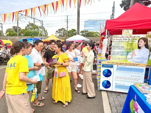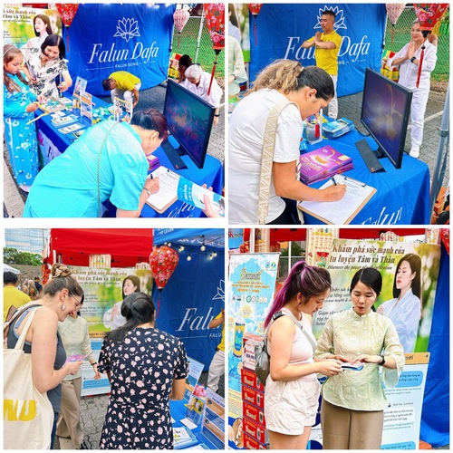 Viele Besucher blieben am Stand der Praktizierenden, sahen der Vorführung der Übungen zu und lasen die Informationstafeln durch. Nachdem sie mehr über die Prinzipien Wahrhaftigkeit, Güte und Nachsicht sowie die gesundheitlichen und geistigen Vorteile von Falun Dafa erfahren hatten, zeigten einige von ihnen reges Interesse und erkundigten sich, wie sie die Praxis erlernen könnten.