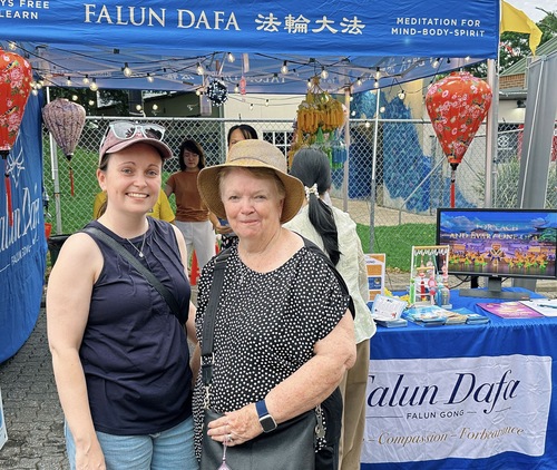 Courtney (links) und ihre Mutter am Stand von Falun Dafa