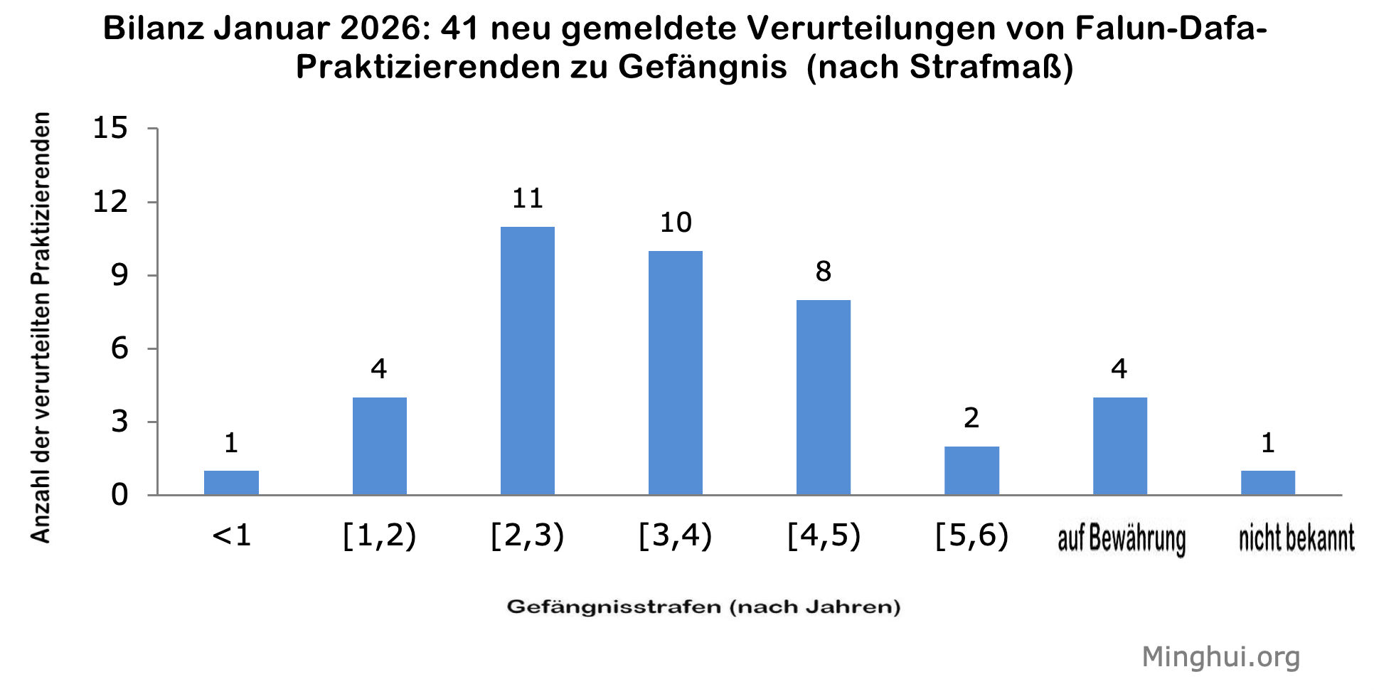 (Minghui.org) Im Januar 2026 wurden insgesamt 41 Fälle von Falun-Dafa-Praktizierenden gemeldet, die wegen ihres Glaubens zu Gefängnisstrafen verurteilt wurden.