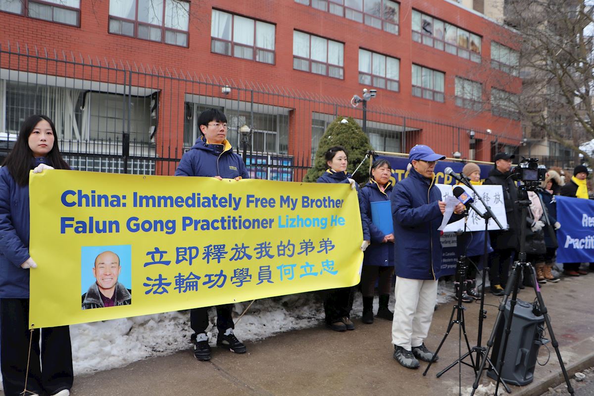 Falun-Gong-Praktizierende in Toronto veranstalten am 12. Februar 2026 vor dem chinesischen Konsulat eine Pressekonferenz zur Rettung ihrer Freunde und Familienmitglieder, die in China wegen ihrer Glaubens inhaftiert sind