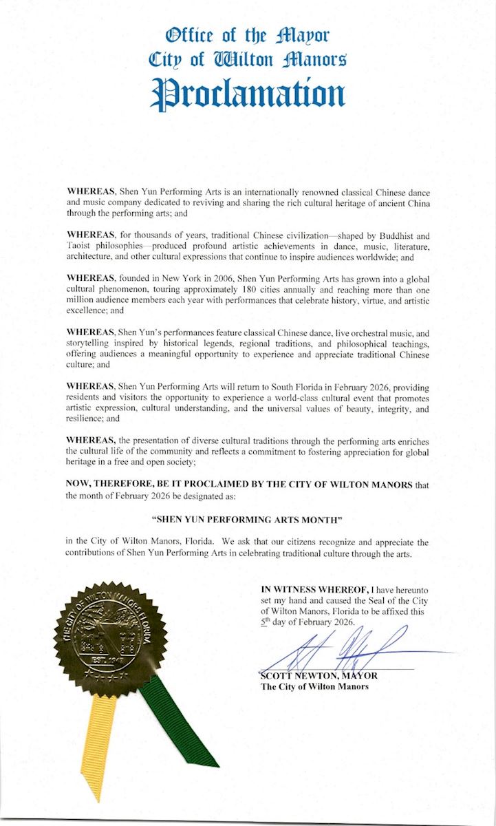 (Minghui.org) Anlässlich der Auftritte von Shen Yun am 17. und 18. Februar 2026 hat Bürgermeister Scott Newton von Wilton Manors im US-Bundesstaat Florida am 5. Februar 2026 den Februar zum „Shen-Yun-Performing-Arts-Monat“ in der Stadt erklärt.