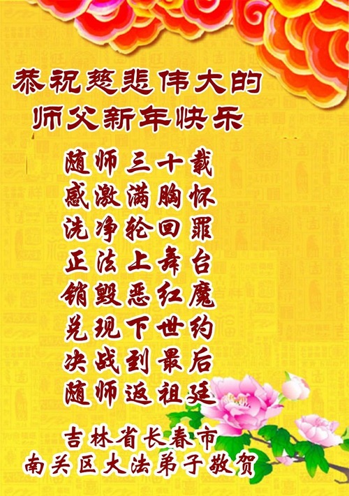 (Minghui.org) Zum chinesischen Neujahrsfest senden Falun-Dafa-Praktizierende auf der ganzen Welt traditionell Grußkarten, Gedichte und Fotos an die Minghui-Website. Damit wünschen sie ihrem barmherzigen, verehrten Meister Li Hongzhi ein frohes neues Jahr.