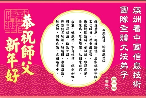 (Minghui.org) Zum chinesischen Neujahrsfest senden Falun-Dafa-Praktizierende auf der ganzen Welt traditionell Grußkarten, Gedichte und Fotos an die Minghui-Website. Damit wünschen sie ihrem barmherzigen, verehrten Meister Li Hongzhi ein frohes neues Jahr.