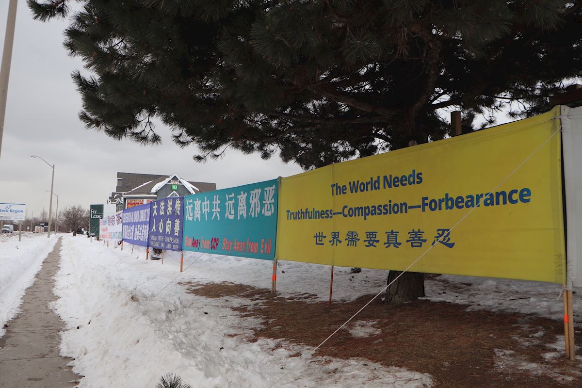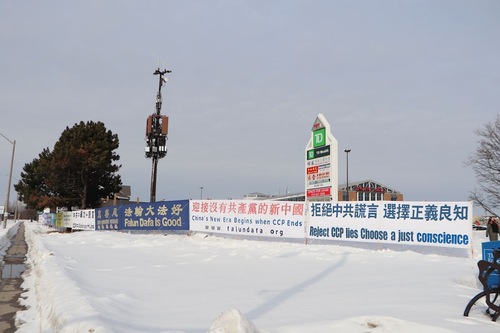 Die Praktizierenden in Toronto haben an der Kreuzung des Platzes einen Informationsstand zur Aufklärung über Dafa eingerichtet. Autoinsassen aus allen Richtungen können ihre Transparente sehen. Die Autofahrer hupen oft oder heben den Praktizierenden gegenüber ihre Daumen als Ermutigung. Die Praktizierenden sind seit zwei Jahrzehnten an diesem Ort. Trotz der Kälte und Schneestürme im Winter oder der sengenden Sommerhitze stellen sie jeden Tag ihre Transparente auf. Sie kommen an diesen Ort, um den Menschen die Fakten über die Verfolgung von Falun Dafa zu erzählen und ihnen zu helfen, aus der KPCh auszutreten, selbst an den kältesten Tagen. Im Durchschnitt helfen sie mindestens 12 Menschen täglich dabei, aus der Kommunistischen Partei Chinas (KPCh) und ihren Unterorganisationen auszutreten.