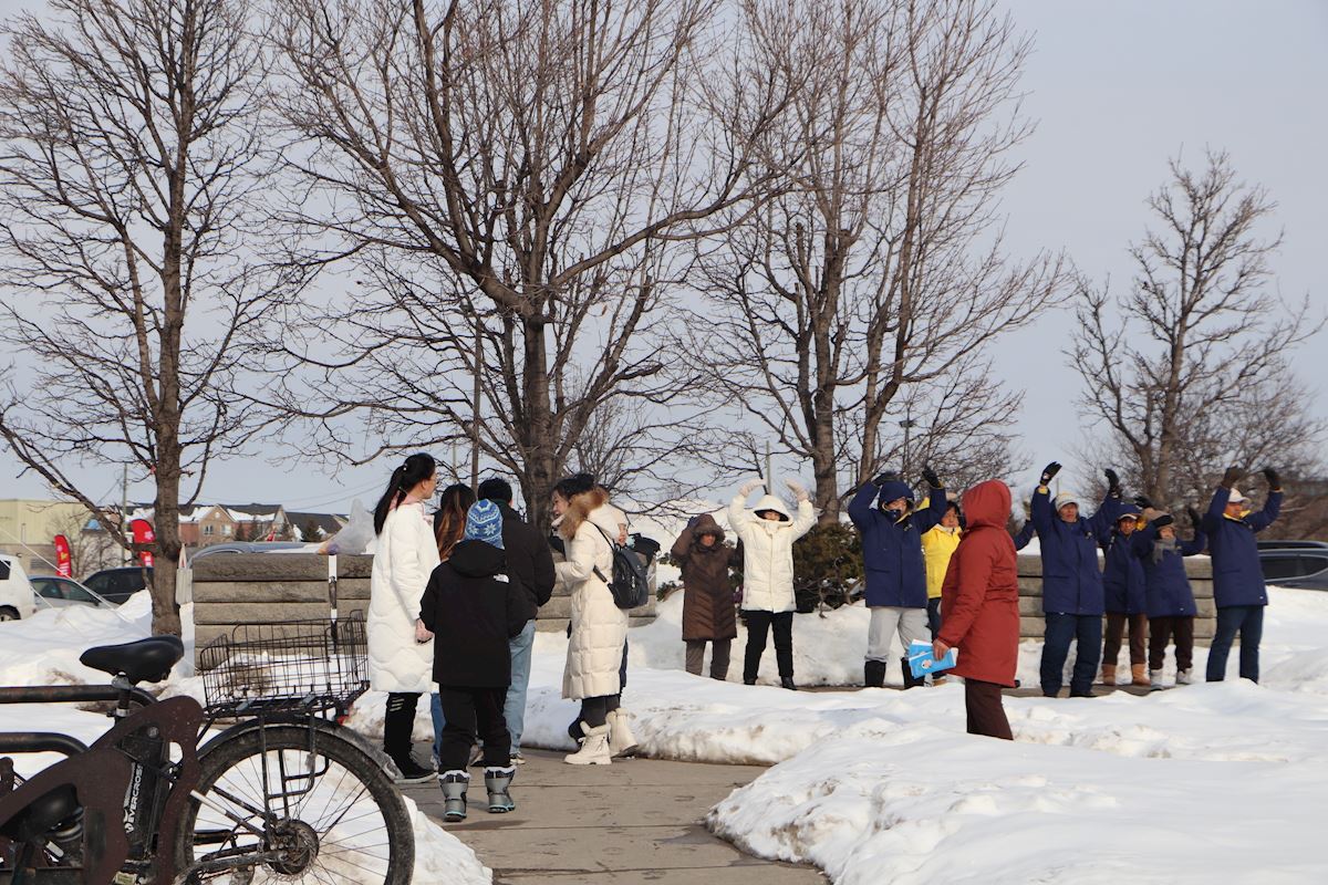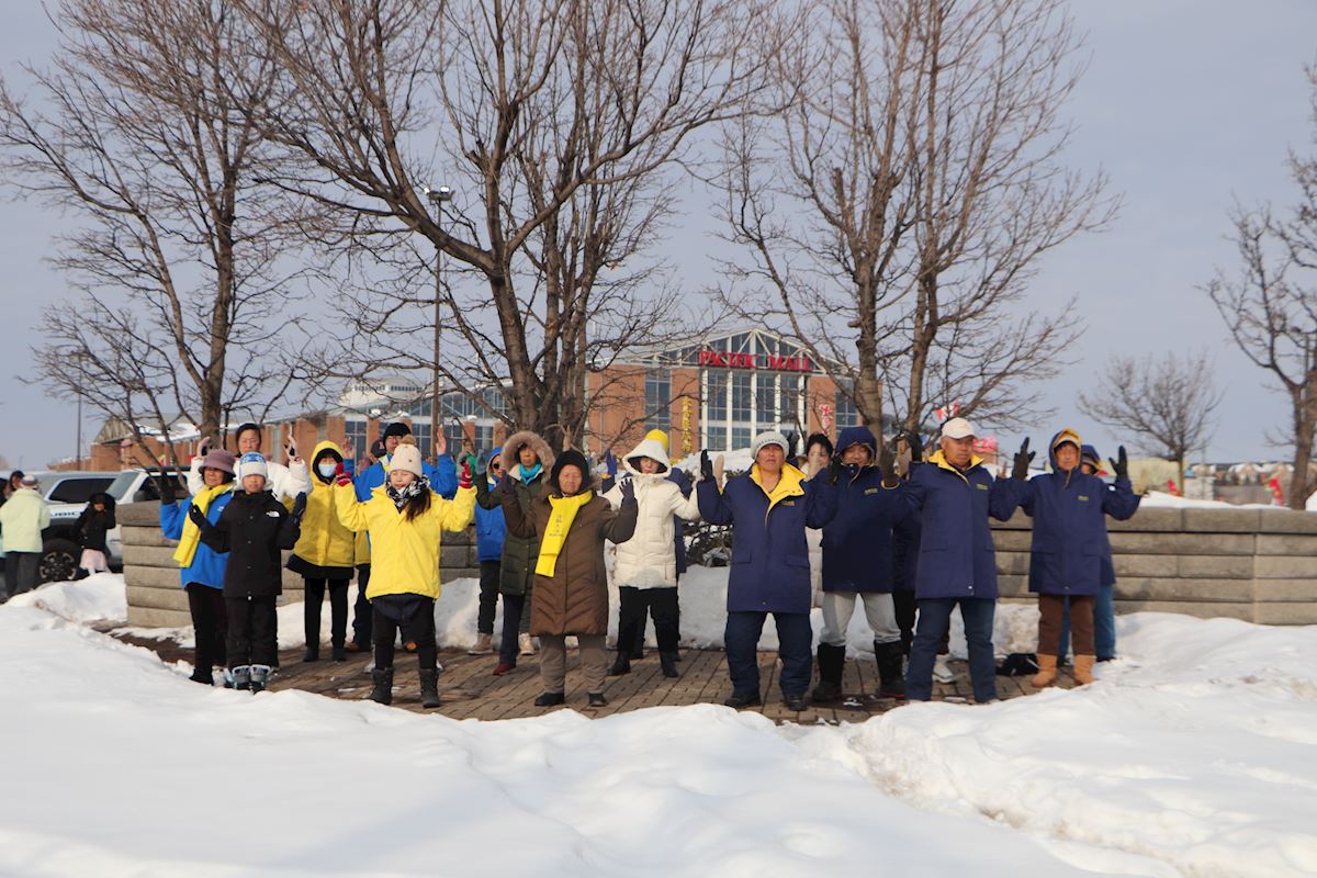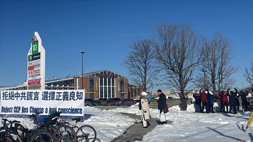 Trotz des kalten Winterwetters machen die Praktizierenden die Übungen, klären die Menschen über die Fakten auf und helfen ihnen, aus der KPCh auszutreten