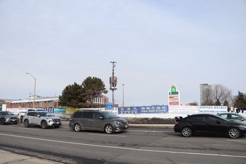Falun-Dafa-Praktizierende haben entlang der Straße zum Pacific Mall Transparente aufgestellt
