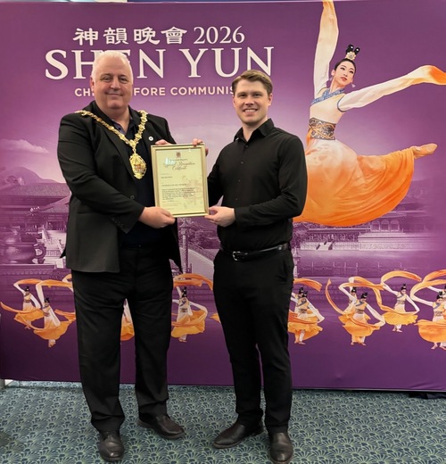(Minghui.org) Steve Watkins, Oberbürgermeister von Stoke-on-Trent, besuchte am Nachmittag des 18. Februar 2026 die zweite Aufführung von Shen Yun Performing Arts im Regent Theatre. Im Anschluss an die Vorstellung überreichte er Shen Yun eine besondere Anerkennungsurkunde des Oberbürgermeisters, um den herausragenden Beitrag des Ensembles zum kulturellen Leben der Stadt zu würdigen.