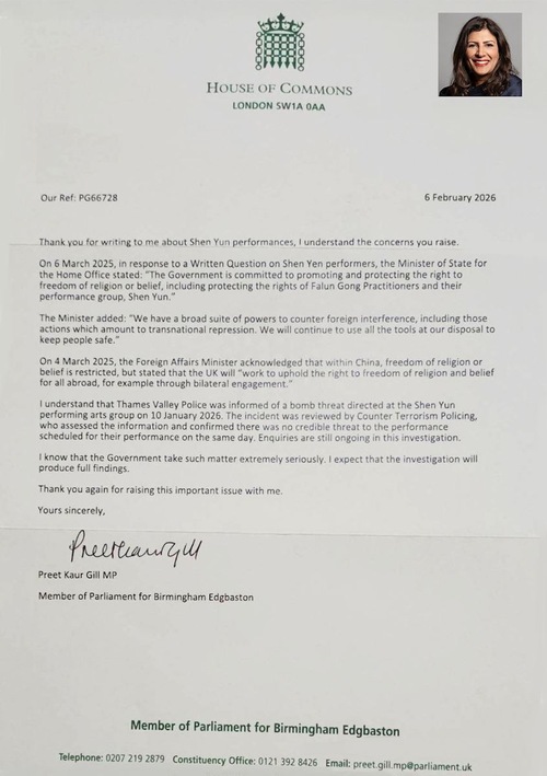 Preet Kaur Gill, Abgeordnete für Birmingham Edgbaston, schrieb: „Am 6. März 2025 erklärte der Staatsminister im Innenministerium in Beantwortung einer schriftlichen Anfrage zu den Shen-Yen-Künstlern: ‚Die Regierung setzt sich für die Förderung und den Schutz des Rechts auf Religions- und Weltanschauungsfreiheit ein, einschließlich des Schutzes der Rechte von Falun-Gong-Praktizierenden und ihrer Künstlergruppe Shen Yun.‘
