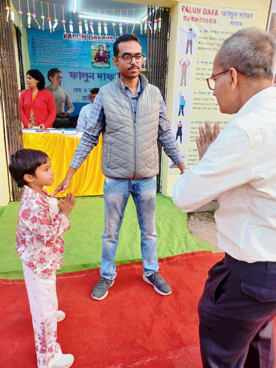 Dhirendranath Mandi, ein Lehrer aus dem Vorort Bongaon, erkannte ebenfalls den Wert der Lehre von Falun Dafa für seine Schüler. Er kaufte Falun Gong und das Zhuan Falun und meldete sich zu einem Web-Seminar an, um die Übungen zu erlernen.