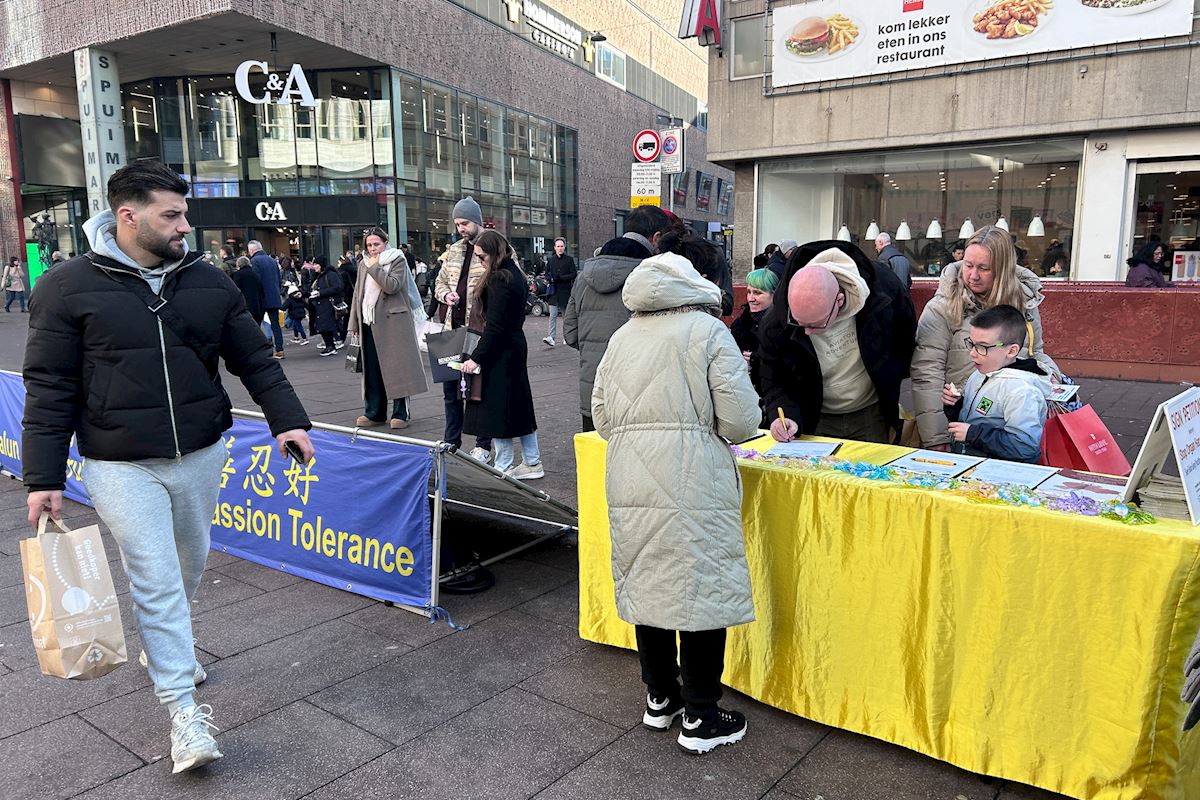 Praktizierende in den Niederlanden veranstalten regelmäßig Informationstage auf der Grote Marktstraat, einer Einkaufsstraße im Zentrum von Den Haag. Dort zeigen sie die fünf Falun-Dafa-Übungen, verteilen Flugblätter und sprechen mit den Passanten. Geschäftsleute, Wissenschaftler, internationale Studierende, Menschenrechtsaktivisten und internationale Touristen bleiben stehen, um mehr über Falun Dafa und die andauernde Verfolgung durch die KPCh zu erfahren. Viele, die zum ersten Mal von der Verfolgung hören, sind schockiert. Andere, die bereits über die Situation Bescheid wissen, drücken ihre Unterstützung und Bewunderung für die Praktizierenden aus.