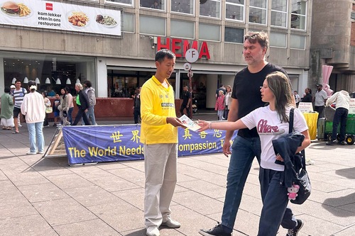 Zwei Professoren der Universität Leiden in den Niederlanden besuchten den Stand und fragten, ob die Praktizierenden Informationsmaterialien in chinesischer Sprache hätten. Sie erklärten, dass sie Biologie unterrichten würden und mit Studenten und Gastwissenschaftlern aus China in Kontakt stünden. Sie hatten festgestellt, dass diese Wissenschaftler nichts von den in China stattfindenden Menschenrechtsverletzungen wussten. Sie wollten ihren chinesischen Kollegen die Informationen zukommen lassen, damit diese die wahren Fakten erfahren und sich von der Indoktrination der KPCh befreien könnten.