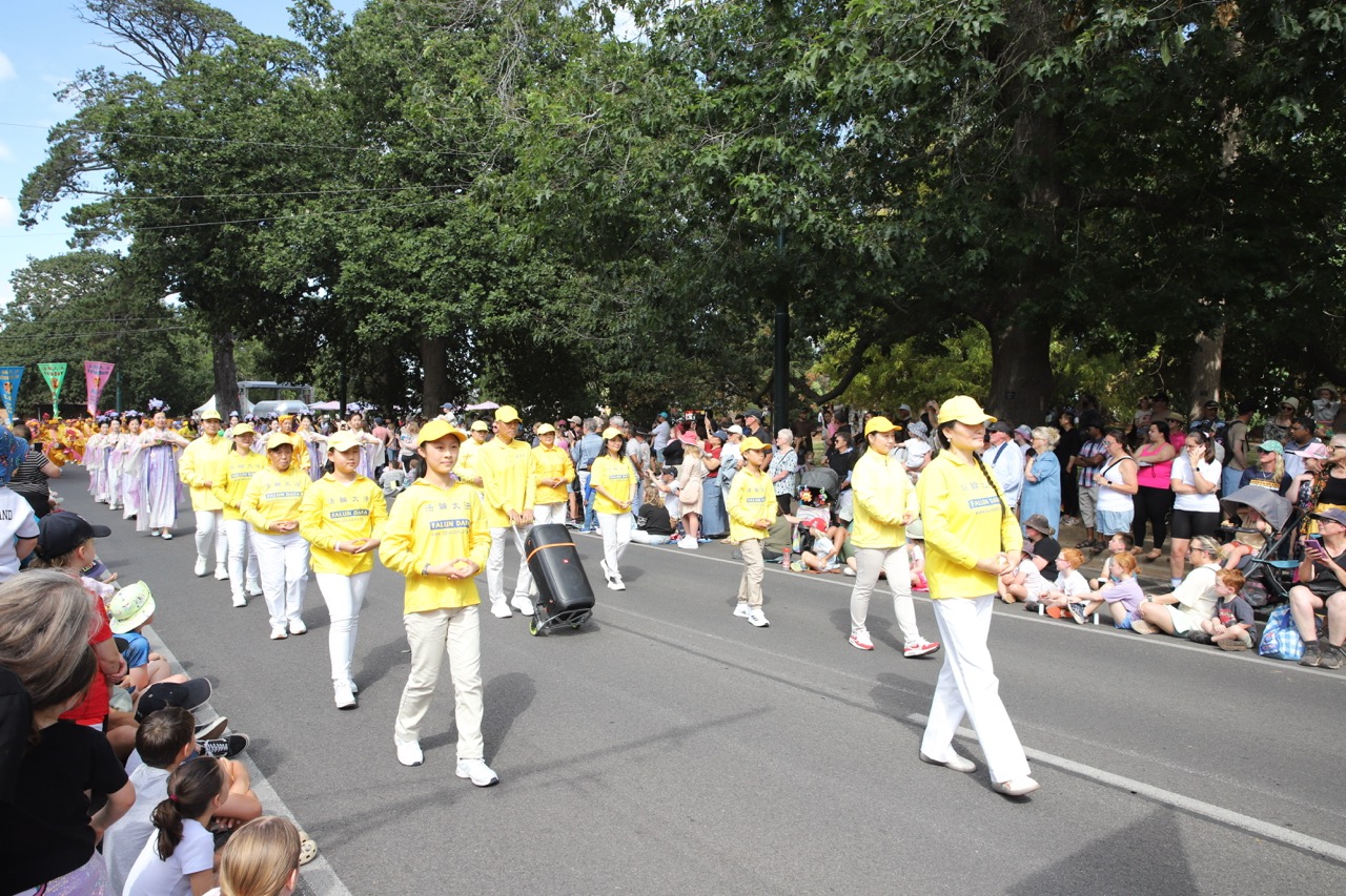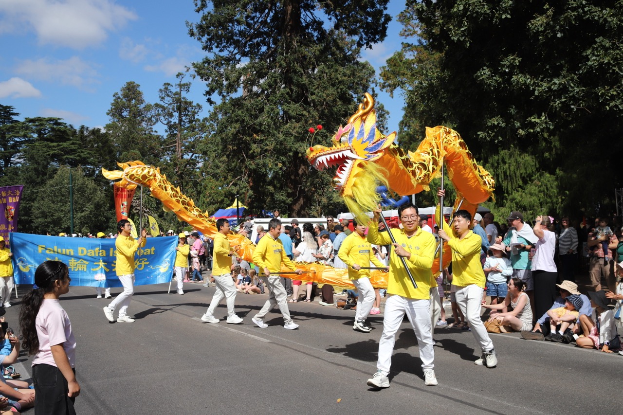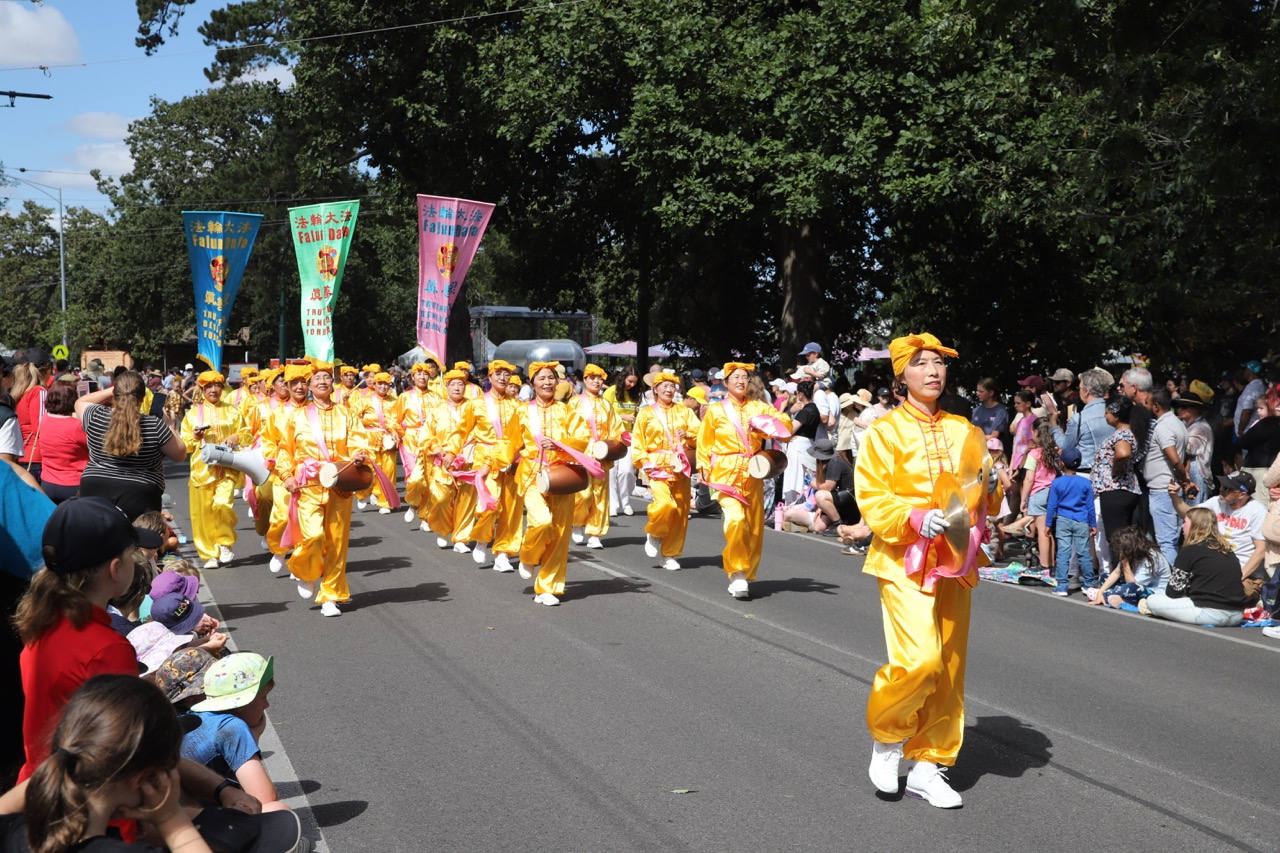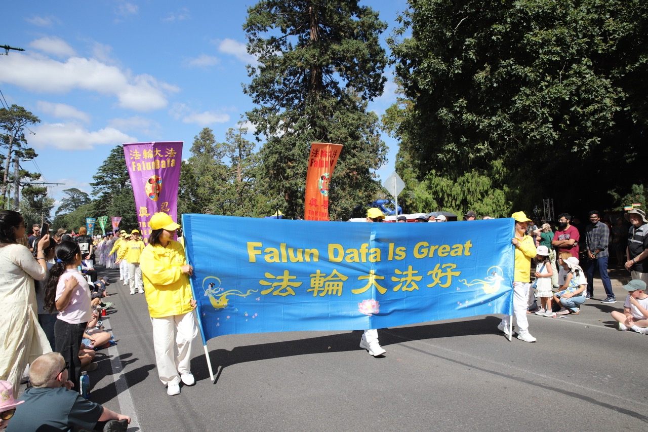 (Minghui.org) Farbenfrohe Kostüme, rhythmische Trommelschläge und ein lebhafter Drachentanz zogen am 9. März 2026 bei der Begonienfestparade in Ballarat die Blicke der Zuschauer auf sich. Praktizierende nutzten die Gelegenheit, um ihnen Falun Dafa vorzustellen. Ihre ruhige Übungsvorführung und die mitreißenden Darbietungen wurden von vielen Besuchern entlang der Paradestrecke begeistert aufgenommen.