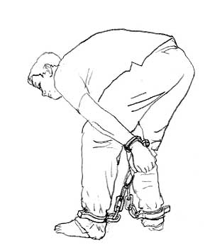 Folterillustration: Gefesselter Häftling, Handschellen und Fußfesseln miteinander verbunden