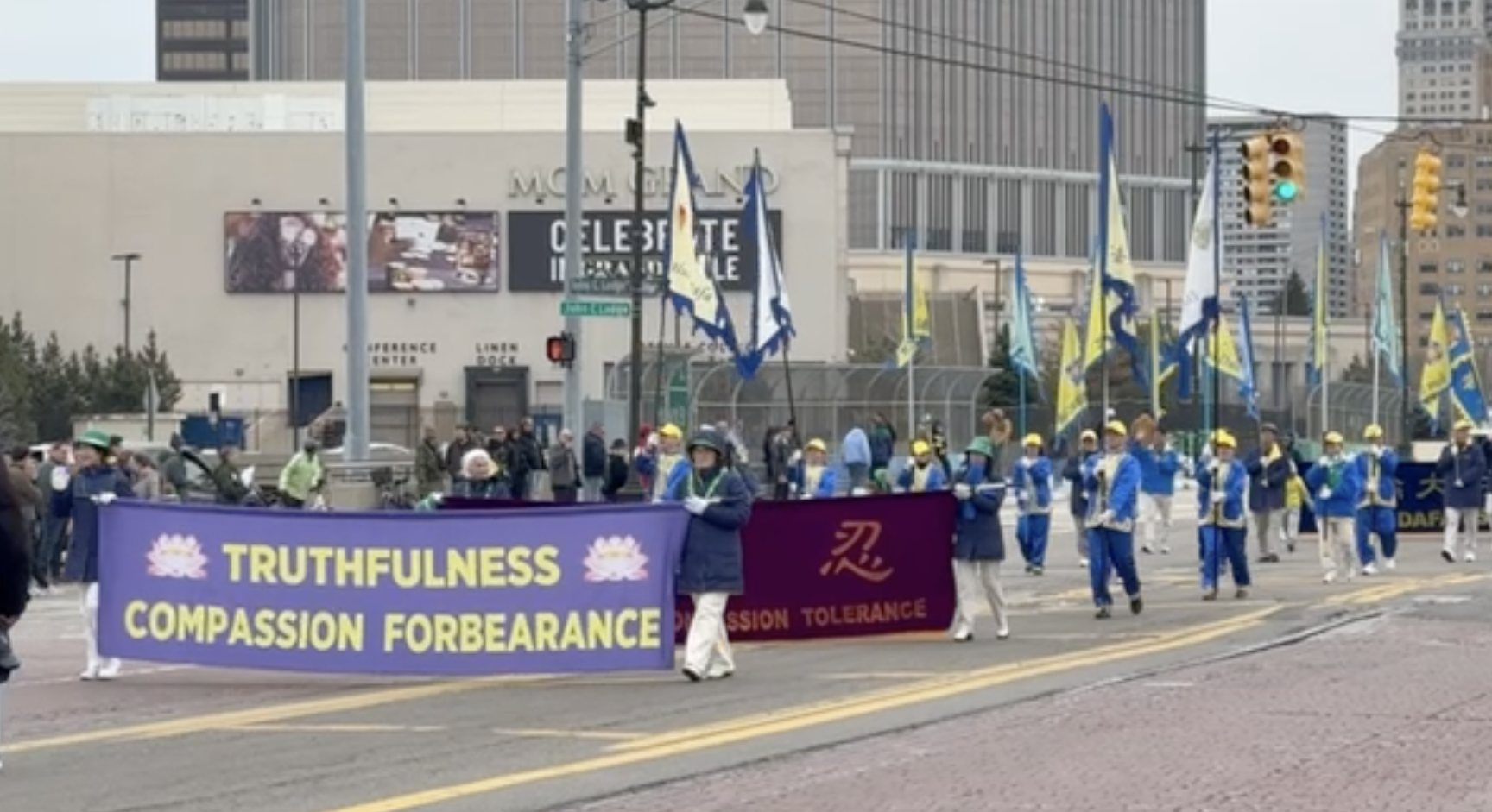 Einige Falun-Dafa-Praktizierende reisten aus Windsor, Kanada, an und schlossen sich den Praktizierenden in Michigan an, um an der Parade teilzunehmen. Ihr Fahnenzug war besonders auffällig. Die Praktizierenden trugen blaue Mäntel und gelbe Hüte und hielten bunte Fahnen. Das Falun-Symbol sowie Botschaften in Englisch und Chinesisch waren zusammen mit „Falun Dafa“ und „Wahrhaftigkeit-Güte-Nachsicht“ auf den Fahnen zu sehen. Die Praktizierenden bildeten ordentliche Gruppen und einige von ihnen erklärten den Zuschauern entlang der Strecke die Vorteile von Falun Dafa. Viele Zuschauer winkten und machten Fotos.