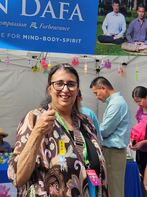 May, eine Falun-Dafa-Praktizierende, die beim Festival am Stand mithalf, berichtete, sie habe lange nach einem spirituellen Weg gesucht, bis sie vor über zehn Jahren Falun Dafa gefunden habe. „Falun Dafa ist etwas so Wunderbares! Ich möchte es mit allen teilen. Deshalb nehme ich an verschiedenen Aktivitäten teil, um Falun Dafa vorzustellen. Ich erzähle den Menschen, wie ich den Sinn des Lebens gefunden und ein tieferes Verständnis für die Bedeutung von Barmherzigkeit für andere gewonnen habe. Falun Dafa hat all meine Fragen zum Leben beantwortet. Ich habe Frieden und wahres Glück gefunden.“