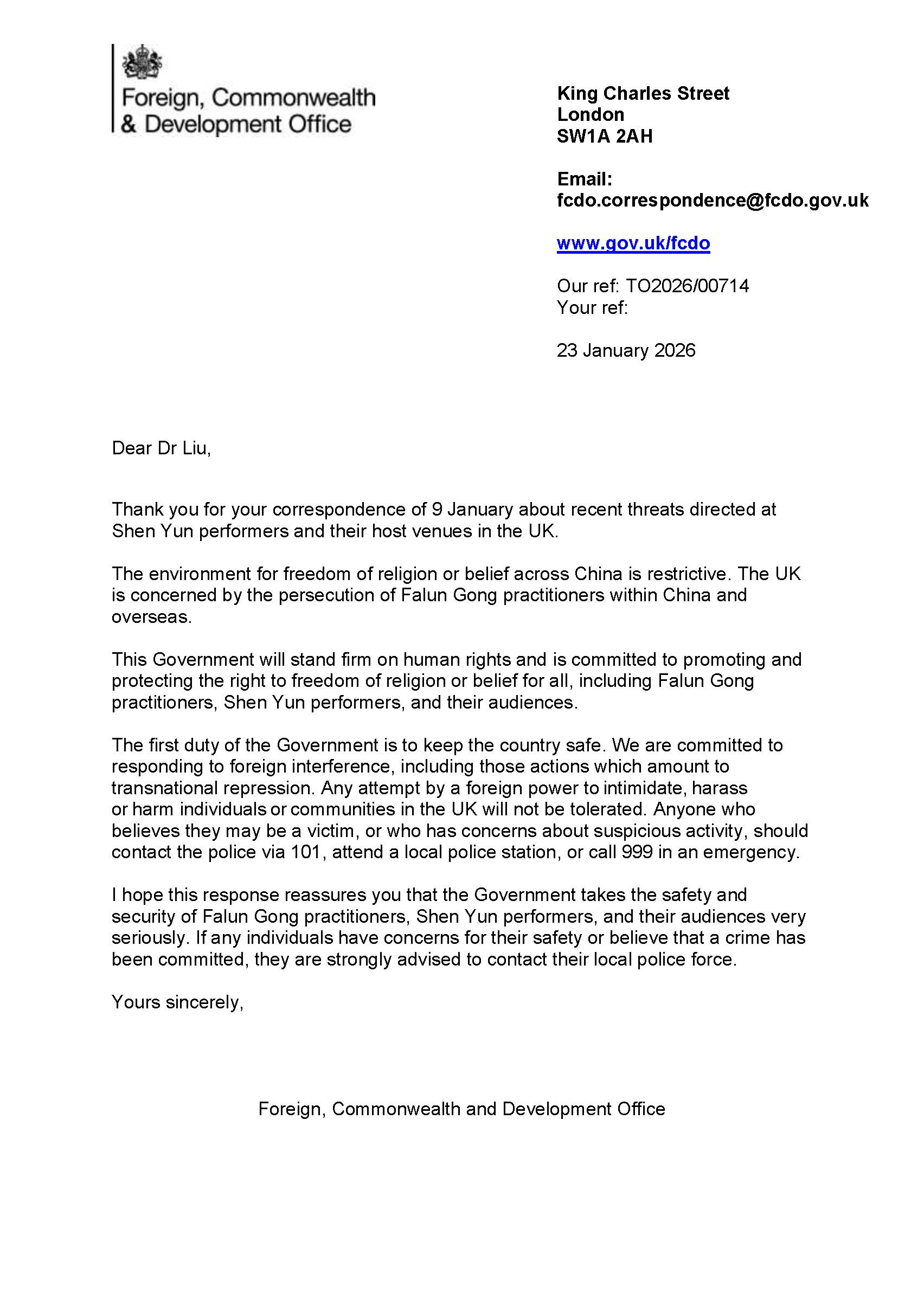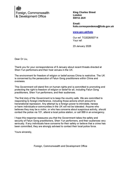 Nachdem die Theater mehrere Drohungen erhalten hatten, sandte das britische Außenministerium (Foreign, Commonwealth and Development Office) am 23. Januar einen Brief an den britischen Falun Dafa Verein, den Veranstalter der Shen-Yun-Aufführungen.
