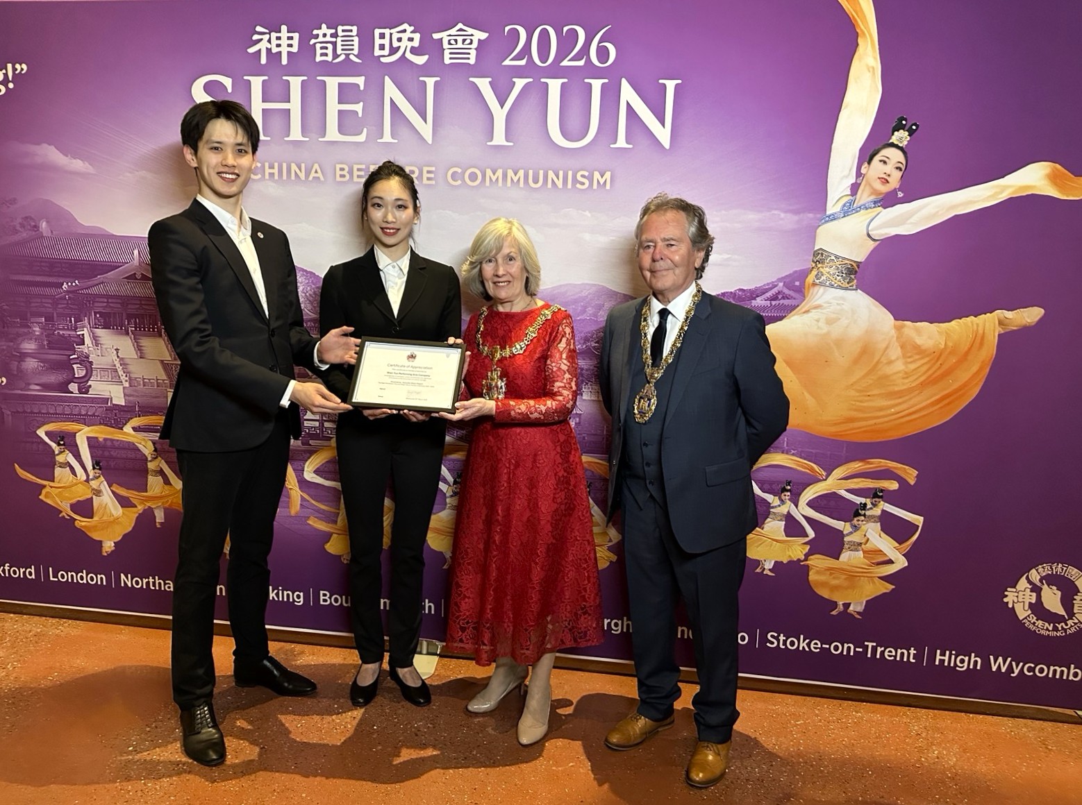 Die England-Tournee von Shen Yun umfasste in dieser Saison England, Schottland und Wales. Zahlreiche Bürgermeister waren anwesend, darunter: Louise Upton, die Oberbürgermeisterin von Oxford; Ramji Chauhan, der ehemalige Bürgermeister von Harrow; Jackie Edwards, die Bürgermeisterin von Bournemouth; Antony Bertola, der Bürgermeister von Llandudno; Carol Marubbi, die ehemalige Bürgermeisterin von Llandudno; Steve Watkins, der Oberbürgermeister von Stoke-on-Trent, sowie Majid Hussain, der Bürgermeister von High Wycombe.