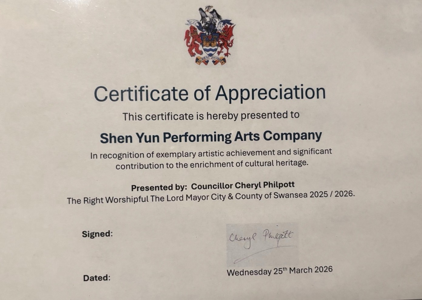 Dankesurkunde von Bürgermeisterin Cheryl Philpott von Swansea