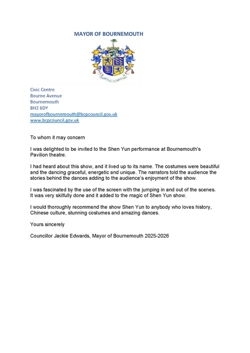 Jackie Edwards, die Bürgermeisterin von Bournemouth, sah sich Shen Yun am 29. Januar an und beschrieb die Aufführung als „eine sehr, sehr unterhaltsame Show“. Am 23. März schickte sie einen Brief, um erneut ihre Begeisterung für die Aufführung zum Ausdruck zu bringen.