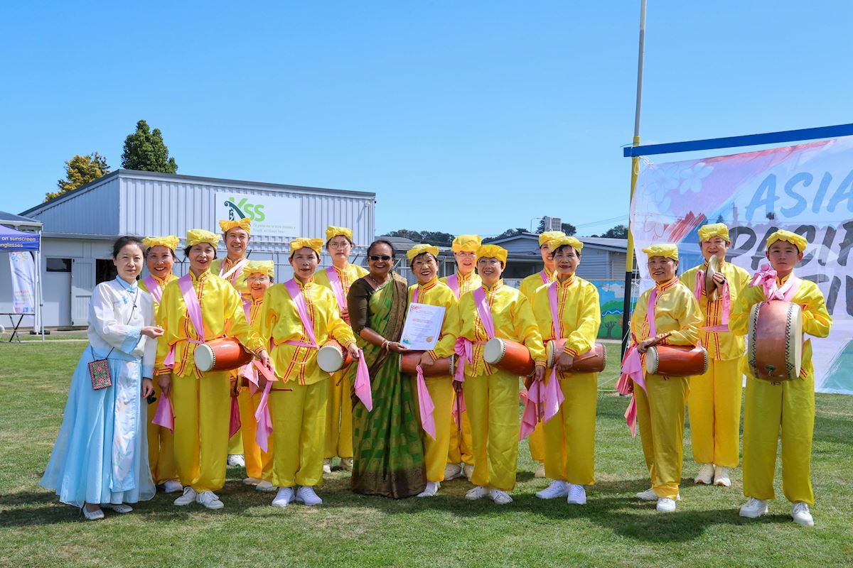 Pushpa Prasad (li.), Vorsitzender des Multikulturellen Rates, Abgeordneter Carl Bates MP (2.v.li.) und Bürgermeister Andrew Tripe (Mitte) überreichen Falun-Dafa-Praktizierenden eine Dankesurkunde für ihre Teilnahme am ersten Asiatisch-Pazifischen Festival in Whanganui