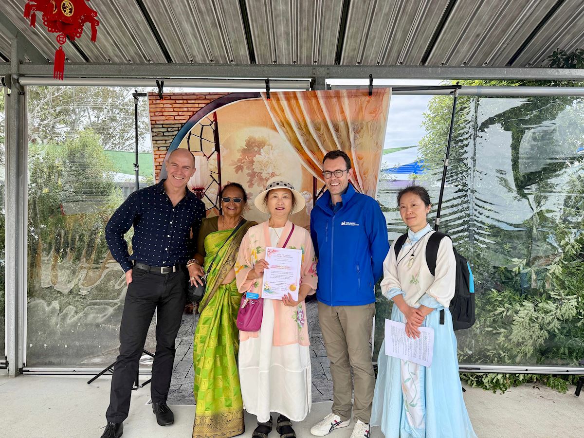 Pushpa Prasad (2.v.re.), Vorsitzende des Multikulturellen Rates, und Tiana New (1.v.re.), Sekretärin des Multikulturellen Rates, überreichen der Drachentanzgruppe eine Dankesurkunde