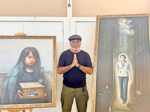 Festivalbesucherin Sharon meinte nach dem Betrachten der Gemälde der Kunst von Zhen Shan Ren: „Absolut fantastische Gemälde. Sie regen zum Nachdenken an und gehen einem wirklich unter die Haut, weil sie so realistisch sind.“