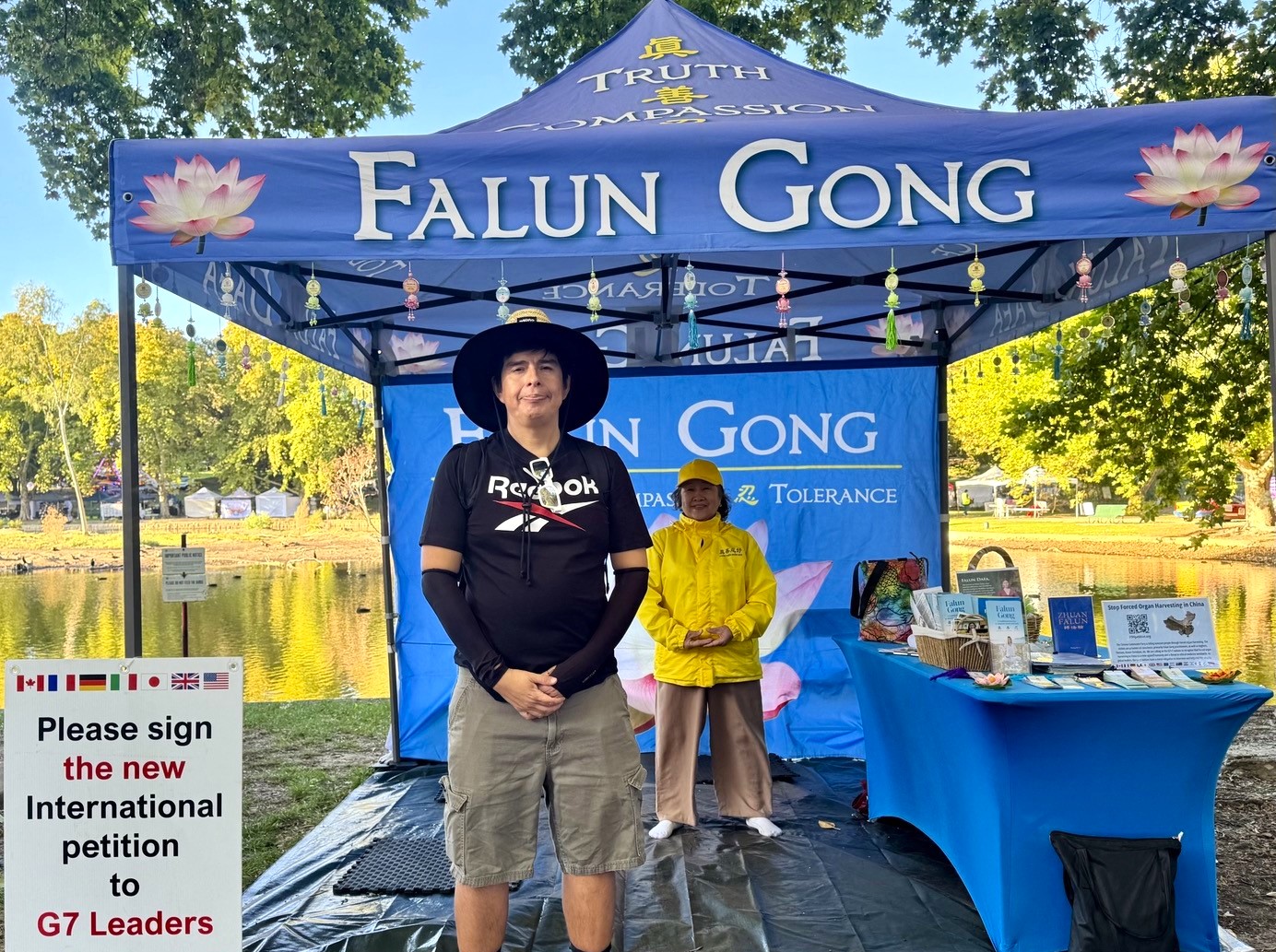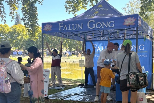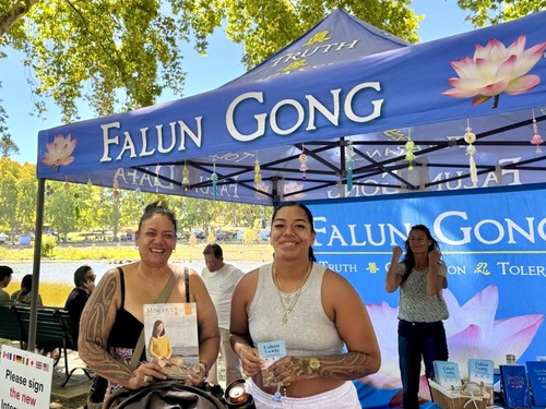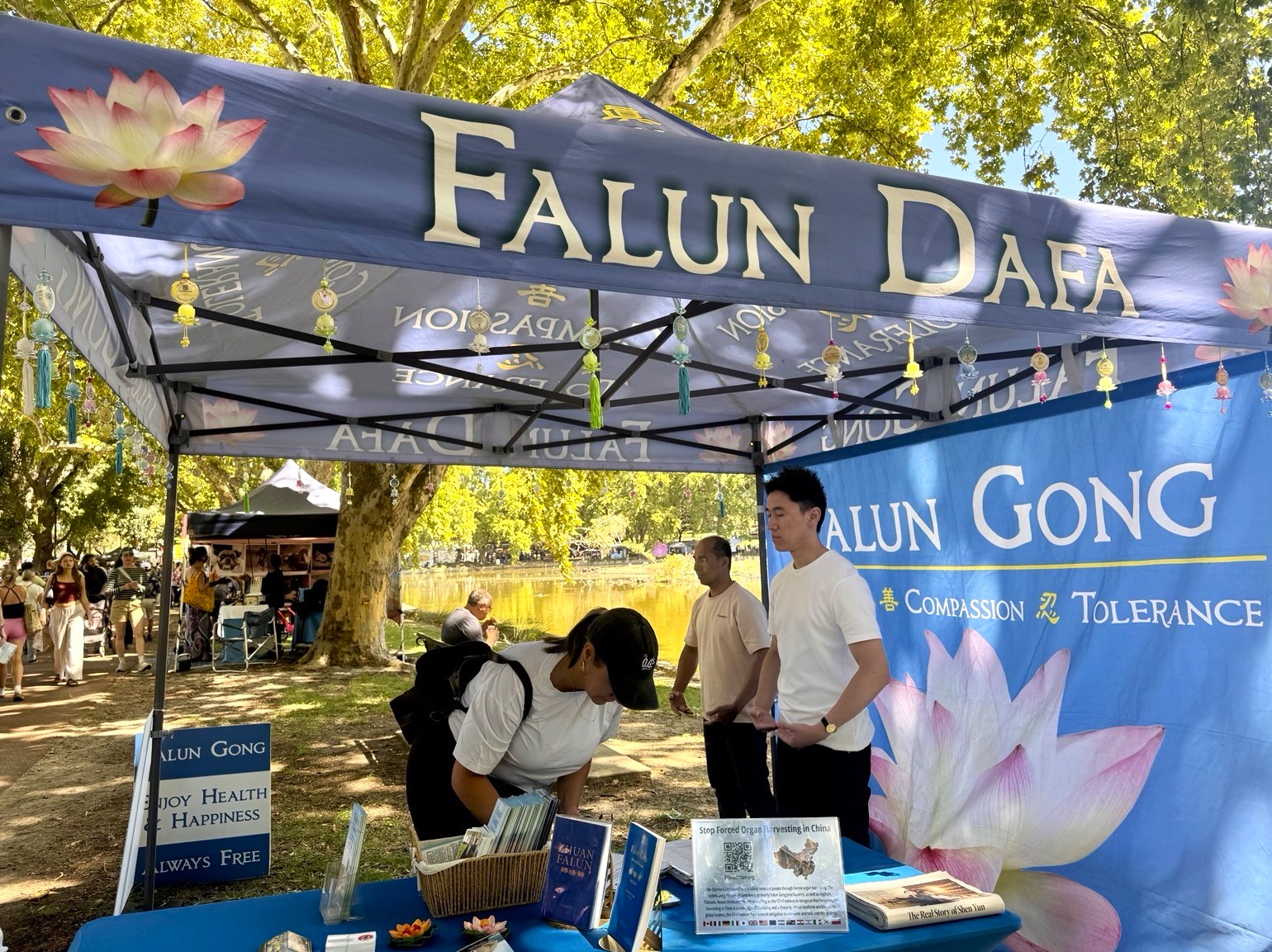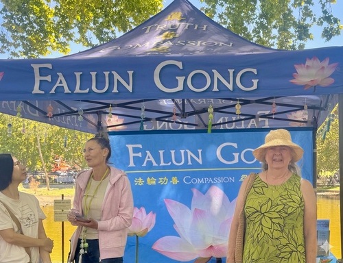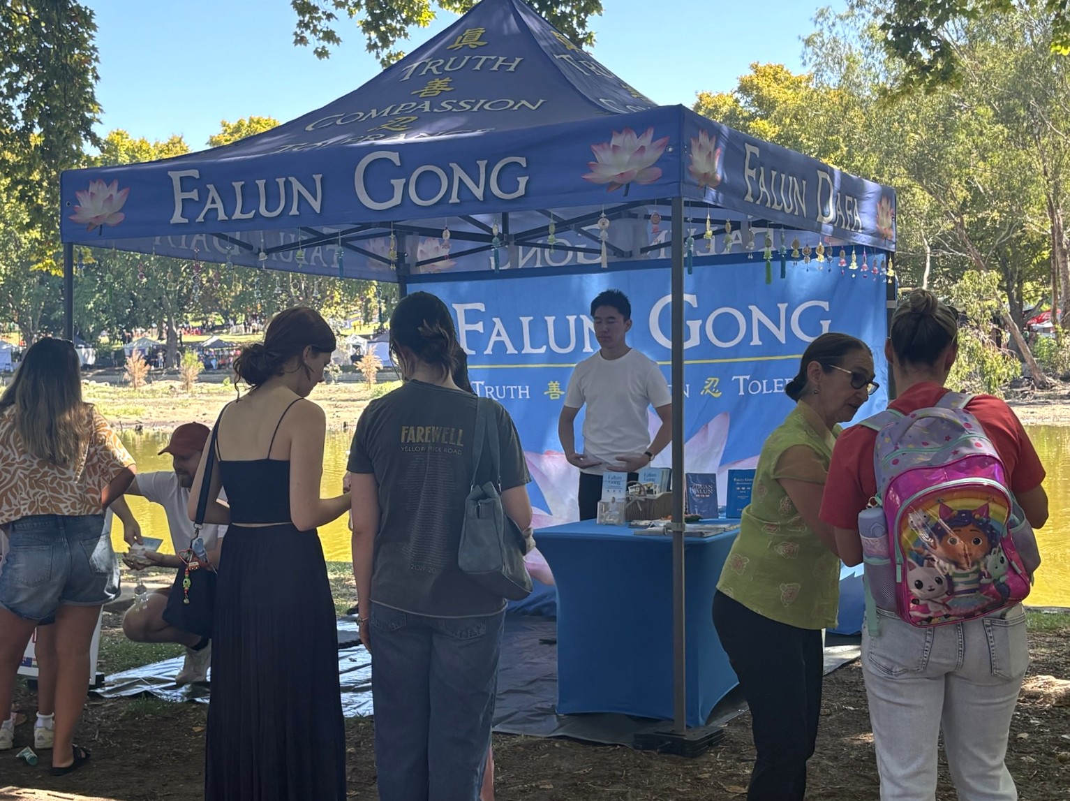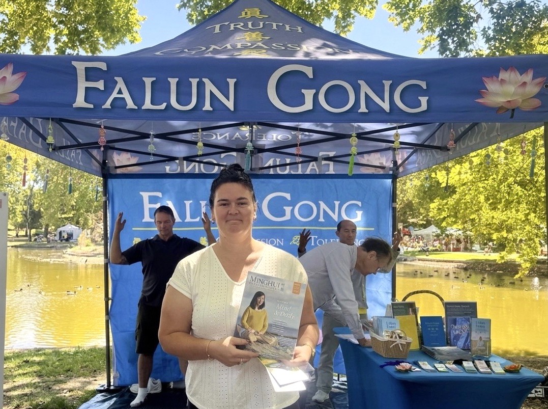 Tegan Green besuchte den Stand der Falun-Dafa-Praktizierenden und äußerte den Wunsch, die Kultivierungsmethode zu erlernen. Sie sagte: „Diese Welt braucht mehr Wahrhaftigkeit, Güte und Nachsicht.“
