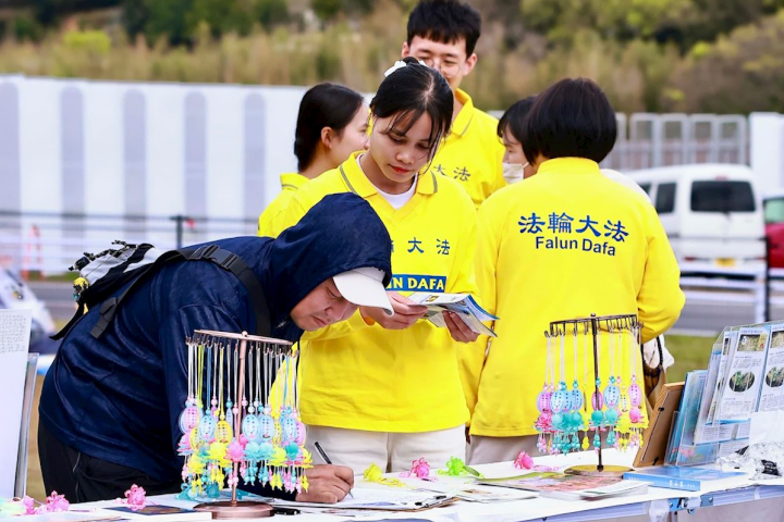Frau Mizuno, die die Praktizierenden bereits am Vortag kennengelernt hatte, brachte ihnen am nächsten Morgen Gutscheine für Tee und Erfrischungen mit und lud sie an ihren Stand ein. Nachdem sie mehr über Falun Dafa und die brutale Verfolgung in China erfahren hatte, unterzeichnete sie eine Petition, die ein Ende der Zwangsorganentnahme durch die KPCh fordert.