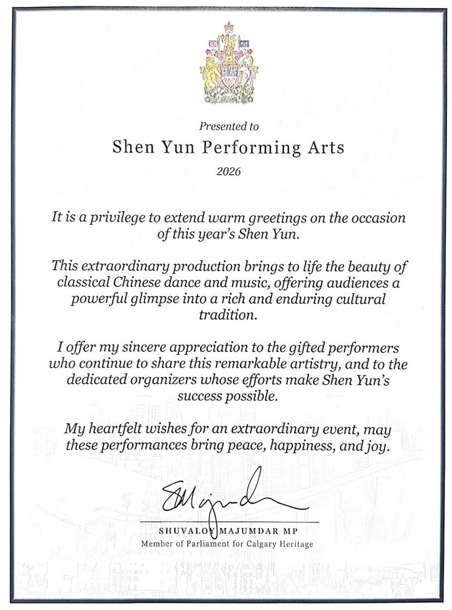 Shuvaloy Majumdar, Abgeordneter für Alberta, schrieb: „Diese außergewöhnliche Produktion erweckt die Schönheit des klassischen chinesischen Tanzes und der Musik zum Leben und bietet dem Publikum einen eindrucksvollen Einblick in eine reiche und beständige kulturelle Tradition.