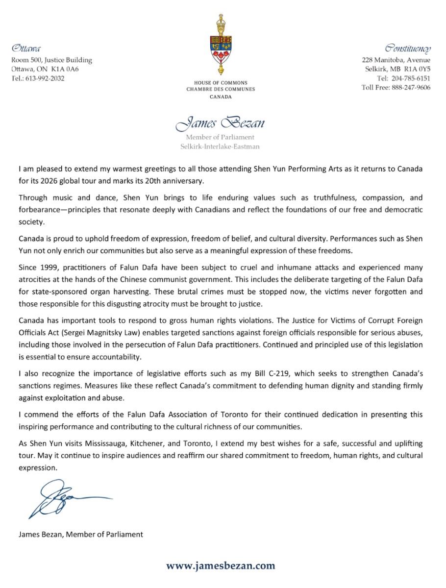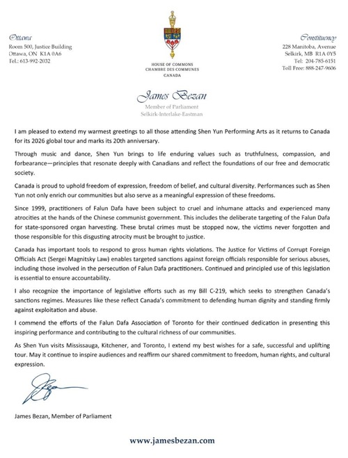 James Bezan, Abgeordneter für Manitoba, schrieb: „Ich freue mich sehr, allen Besuchern der Aufführungen von Shen Yun Performing Arts meine herzlichsten Grüße zu übermitteln. Das Ensemble tritt 2026 im Rahmen seiner Welttournee erneut in Kanada auf und feiert gleichzeitig sein 20-jähriges Jubiläum.