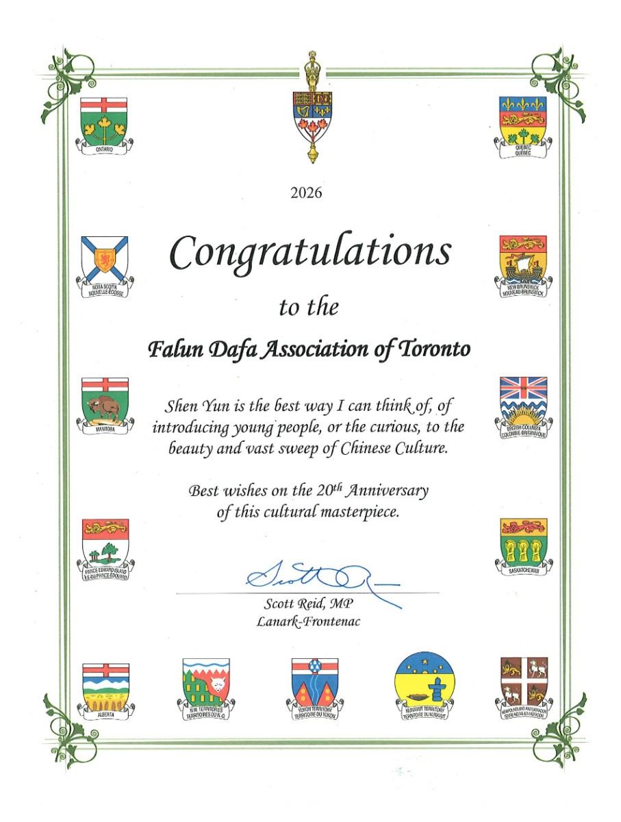 Scott Reid erklärte: „Shen Yun ist meiner Meinung nach die beste Möglichkeit, jungen Menschen und Neugierigen die Schönheit und Vielfalt der chinesischen Kultur näherzubringen. Herzliche Glückwünsche zum 20. Jubiläum dieses kulturellen Meisterwerks.“