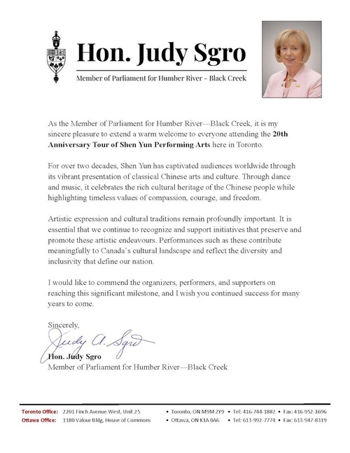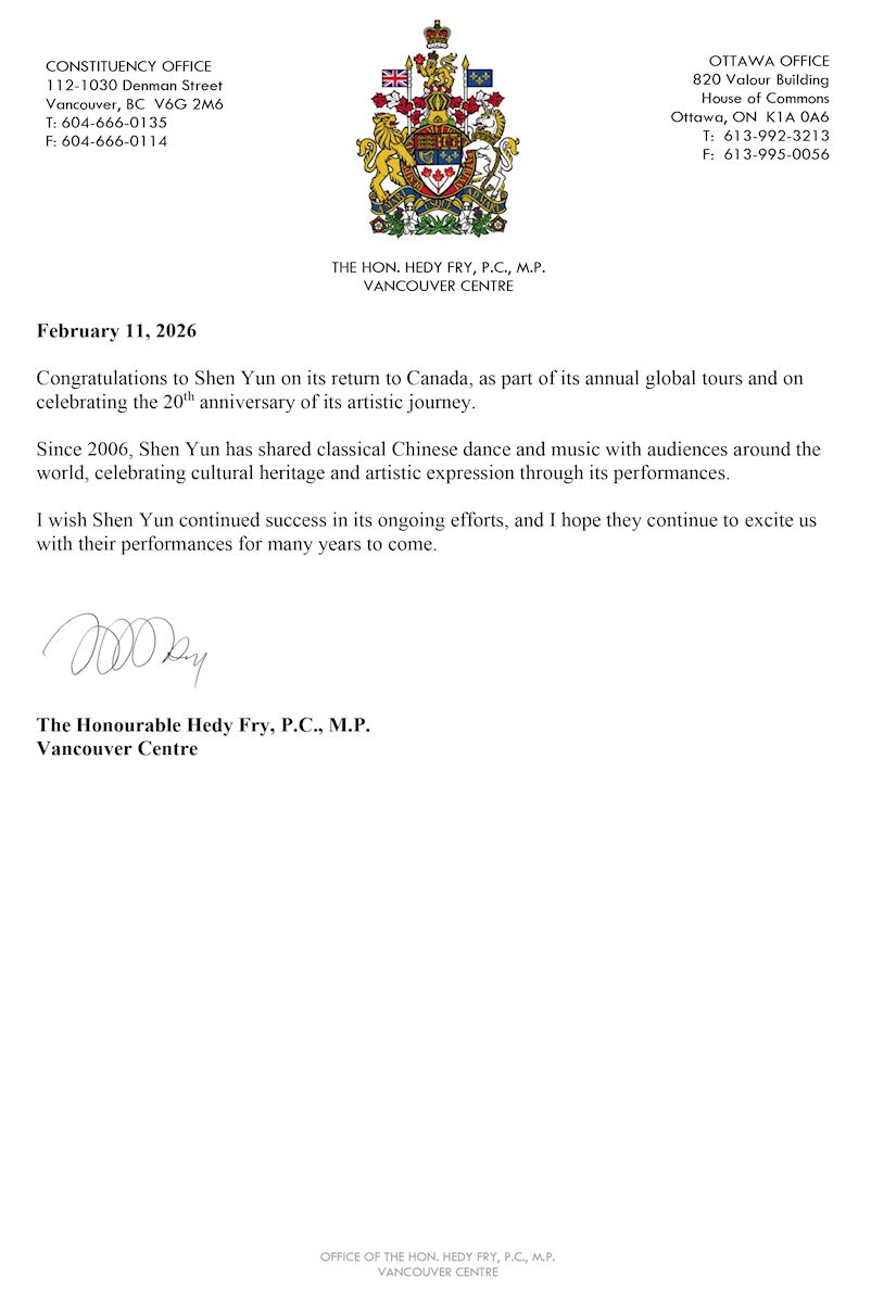 Hedy Fry, Abgeordnete für Vancouver Centre, schrieb: „Herzlichen Glückwunsch an Shen Yun zum erneuten Auftritt in Kanada im Rahmen der jährlichen Welttourneen und zum 20-jährigen Jubiläum der künstlerischen Laufbahn.