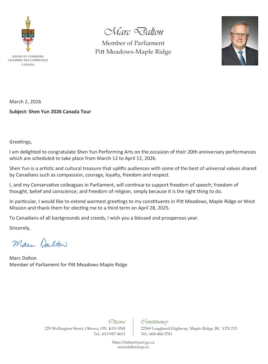 Marc Dalton, Abgeordneter für Pitt Meadows-Maple Ridge, schrieb: „Shen Yun ist ein künstlerischer und kultureller Schatz, der das Publikum mit einigen der besten universellen Werte, die Kanadier teilen, wie Barmherzigkeit, Mut, Loyalität, Freiheit und Respekt, bereichert.“