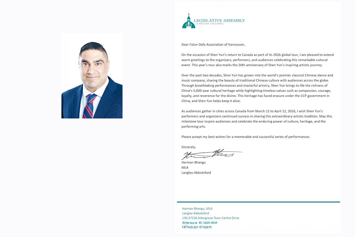 Harman Bhangu, Mitglied der Gesetzgebenden Versammlung von British Columbia, schrieb: „In den vergangenen zwei Jahrzehnten hat sich Shen Yun zur weltweit führenden Kompanie für klassischen chinesischen Tanz und Musik entwickelt und teilt die Schönheit der traditionellen chinesischen Kultur mit einem Publikum auf der ganzen Welt. Durch atemberaubende Aufführungen und meisterhafte Kunstfertigkeit erweckt Shen Yun den Reichtum des 5.000 Jahre alten chinesischen Kulturerbes zum Leben und hebt zeitlose Werte wie Güte, Mut, Loyalität und Ehrfurcht vor dem Göttlichen hervor. Dieses Erbe war unter der KPCh-Regierung in China von der Auslöschung bedroht, und Shen Yun trägt dazu bei, es am Leben zu erhalten.“