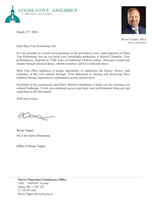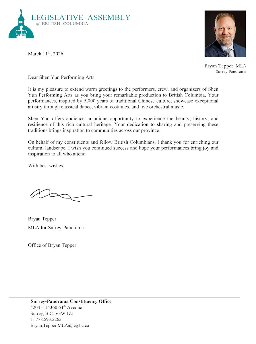 Bryan Tepper, Abgeordneter der Gesetzgebenden Versammlung von British Columbia, schrieb: „Es ist mir eine Freude, den Künstlern, dem Team und den Organisatoren von Shen Yun Performing Arts herzliche Grüße zu übermitteln und sie zu ihrer bemerkenswerten Produktion in British Columbia zu begrüßen. Ihre Aufführungen, beseelt von 5.000 Jahren traditioneller chinesischer Kultur, zeugen von außergewöhnlichem künstlerischem Schaffen durch klassischen Tanz, farbenprächtige Kostüme und Orchestermusik.