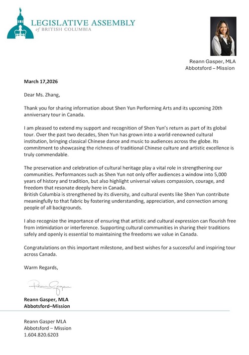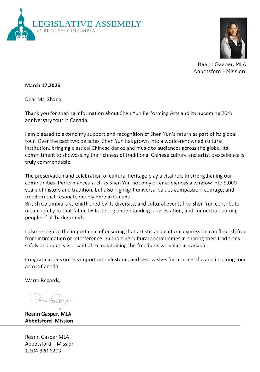 Reanne Gasper, Mitglied der Gesetzgebenden Versammlung von British Columbia, schrieb: „In den vergangenen zwei Jahrzehnten hat sich Shen Yun zu einer weltbekannten Kulturinstitution entwickelt, die klassische chinesische Tänze und Musik einem Publikum auf der ganzen Welt näherbringt. Ihr Engagement für die Präsentation des Reichtums der traditionellen chinesischen Kultur und ihre künstlerische Exzellenz sind wahrhaft lobenswert.“