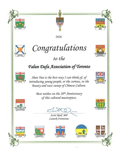 Der konservative Abgeordnete Costas Menegakis, der den Wahlkreis Aurora-Oak Ridges-Richmond Hill vertritt, überreichte Shen Yun eine Urkunde und merkte an, dass das Ensemble „das Publikum weltweit mit klassischem chinesischen Tanz und Musik begeistert und den Reichtum traditioneller Kultur, künstlerische Spitzenleistung und zeitlose Werte vermittelt“.