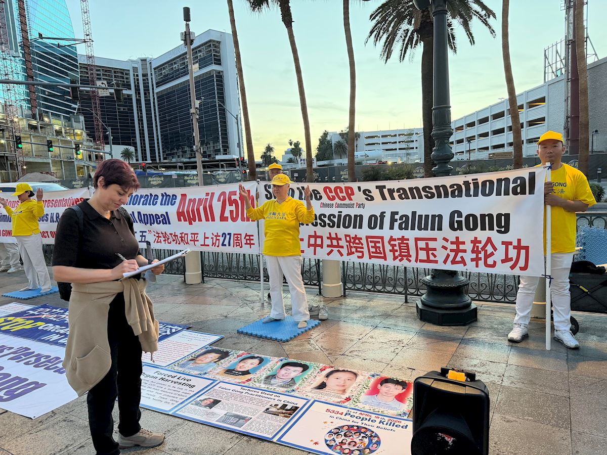Eine Frau unterschrieb die Petition und sprach anschließend mit einer Praktizierenden. Zur Verfolgung kommentierte sie: „Ja, das ist schrecklich.Die Menschen sollten wissen, dass dies Teil der Bosheit der KPCh ist. Die KPCh nimmt den Menschen in China die Religionsfreiheit. Die ganze Welt sollte davon erfahren.“