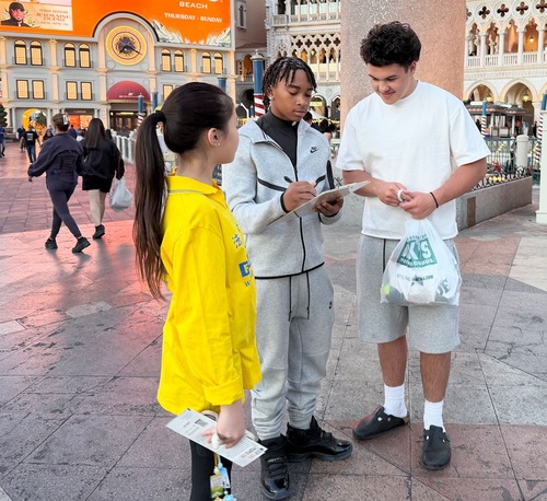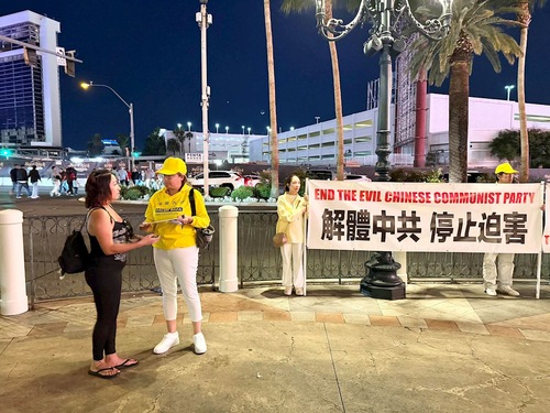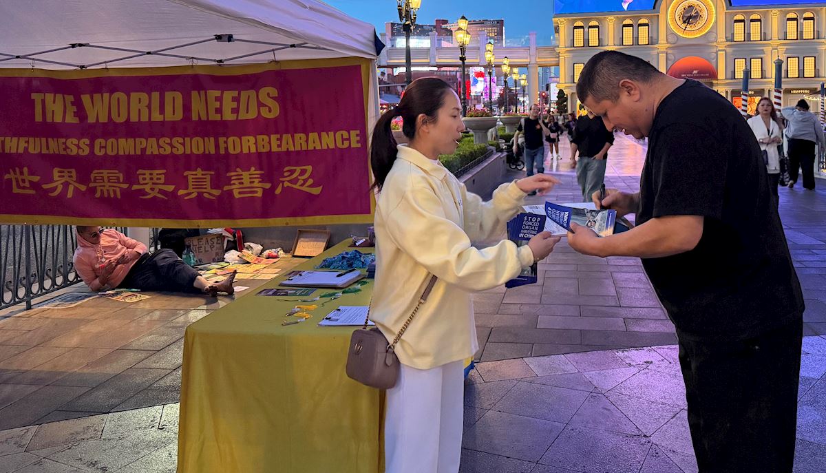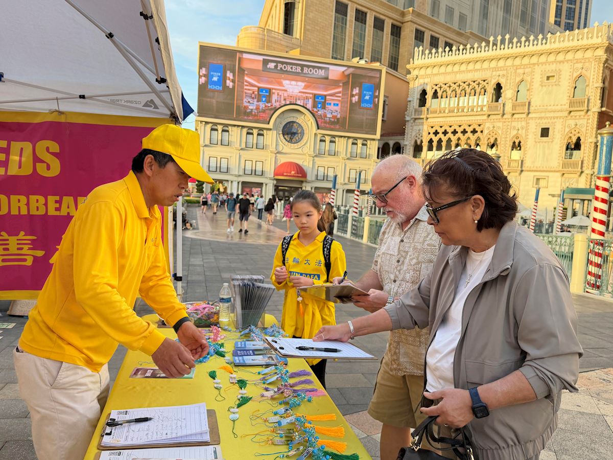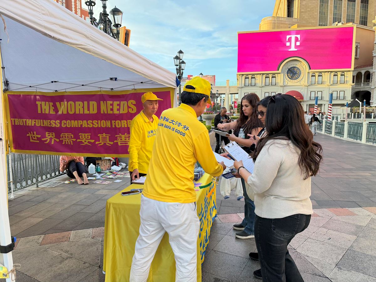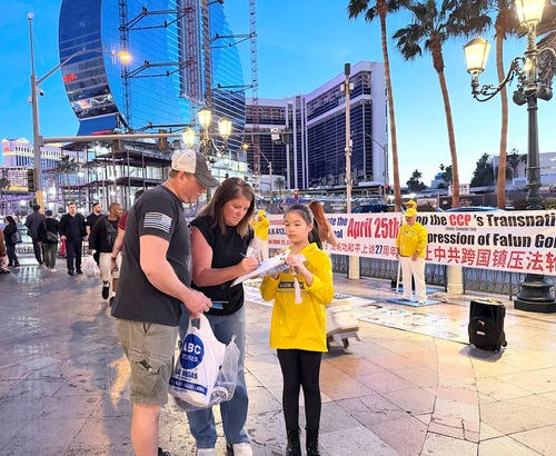 (Minghui.org) Am Abend des 18. April 2026 hielten Falun-Dafa-Praktizierende in Las Vegas, USA, eine Gedenkveranstaltung auf dem Las Vegas Strip vor dem Venetian Hotel ab. Damit erinnerten sie an die friedliche Petition von Falun-Dafa-Praktizierenden, die vor 27 Jahren in Peking stattfand und weltweit große Aufmerksamkeit erregte.