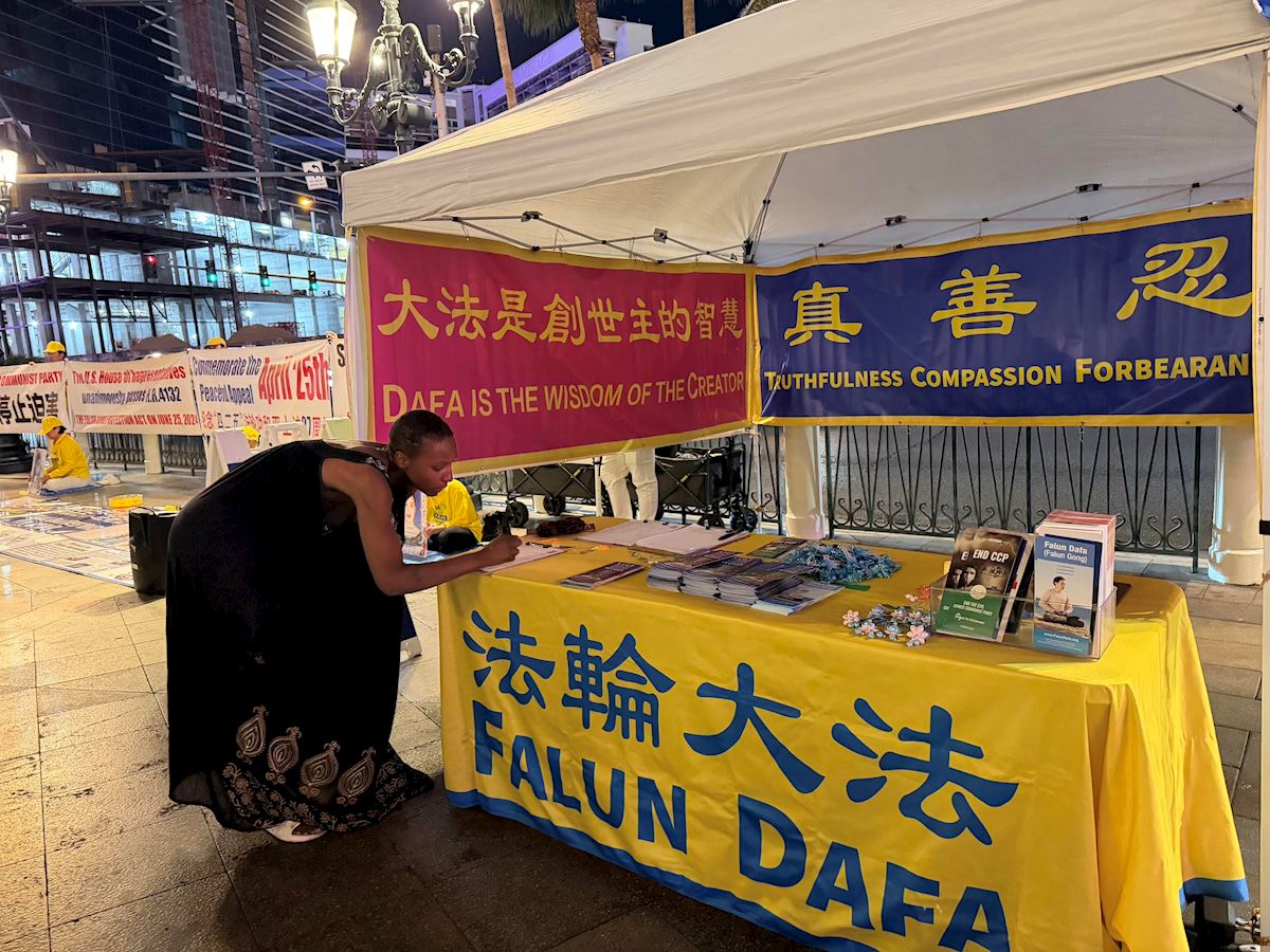 Am Abend kamen die Anwohnerin Tami und ein Begleiter am Veranstaltungsort vorbei. Die Transparente weckten ihr Interesse, und sie suchten von sich aus das Gespräch. Eine Praktizierende erläuterte ihnen, dass Falun Dafa eine traditionelle Kultivierungsmethode ist, die auf den Prinzipien Wahrhaftigkeit, Güte und Nachsicht beruht. Sie dient nicht nur der Förderung der Gesundheit, sondern auch der moralischen Entwicklung des Menschen. Zugleich erfuhren sie, dass diese friedliche Praxis in China seit nunmehr 27 Jahren verfolgt wird.