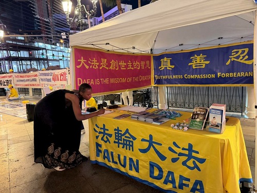 Am Veranstaltungsort stellten die Praktizierenden einen Pavillon auf und hängten Transparente auf. Die klaren Botschaften zogen viele Passanten an, von denen einige stehenblieben und sie aufmerksam durchlasen. Andere nahmen Informationsmaterial mit und kamen ins Gespräch mit Praktizierenden. Wieder andere unterschrieben die Petition zur Beendigung der Verfolgung.