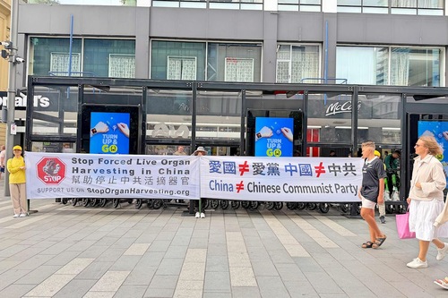 Transparente mit Informationen über die Verfolgung von Falun Dafa im Stadtzentrum von Auckland