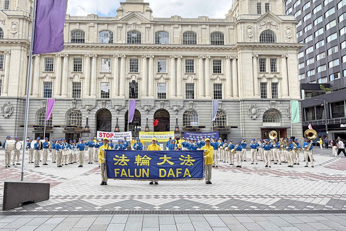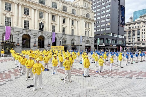 Am 18. April 2026 führen Falun-Dafa-Praktizierende im Stadtzentrum von Auckland die Übungen vor, um des friedlichen Appells vom 25. April zu gedenken