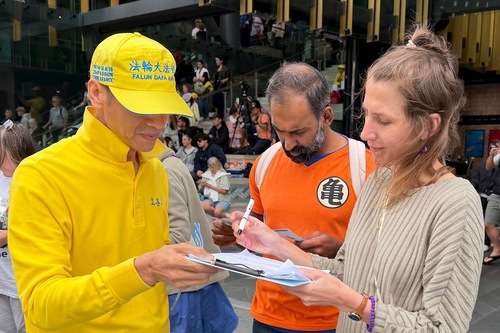 Vor Ort erklärten die Praktizierenden den Passanten die Hintergründe der seit mehr als 20 Jahren andauernde Verfolgung von Falun Dafa durch die Kommunistische Partei Chinas (KPCh), was viele Menschen nachdenklich stimmte.